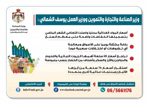 وأضاف الشمالي أن الوزارة تراقب بشكل مستمر أسعار السلع التموينية محليا ورصد المتغيرات التي تطرأ على أسعارها عالميا إضافة الى رقابة المحلات التجارية لمتابعة التزامها بأحكام قانون الصناعة والتجارة والتشريعات الأخرى الناظمة للسوق.