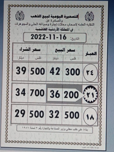وبلغ سعر بيع غرام الذهب عيار 21 الأكثر طلبا 36،20 ديناراً لغايات شراء المواطنين، مقابل 34،70 دينارا لجهة البيع لمحال الصاغة.
