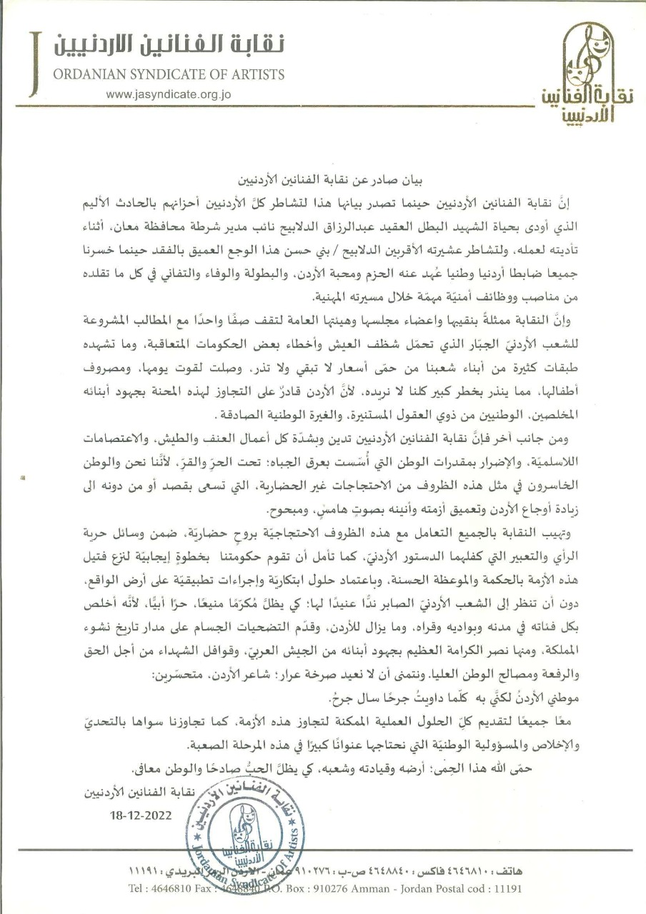 وأدانت نقابة الفنانيين الأردنيين أعمال العنف والطيش، والاعتصامات اللاسلمية، والإضرار بمقدرات الوطن التي أسست بعرق الجباه تحت الحر والقر، حيث إننا والوطن الخاسرون في مثل هذه الظروف من الاحتجاجات غير الحضارية، والتي تسعى بقصد أو من دونه الى زيادة أوجاع الأردن وتعميق أزمته وأنينه بصوت هامس، ومبحوح