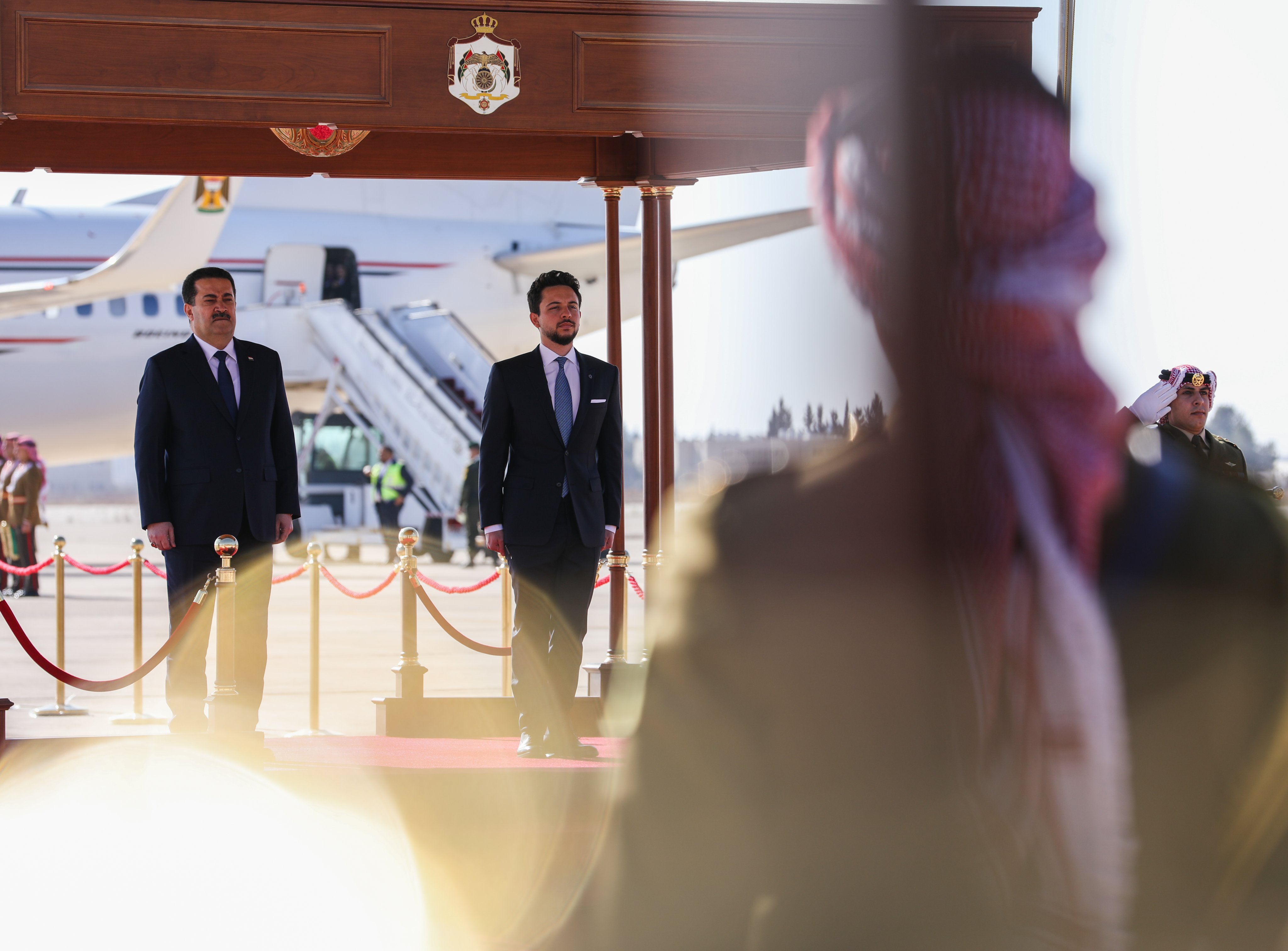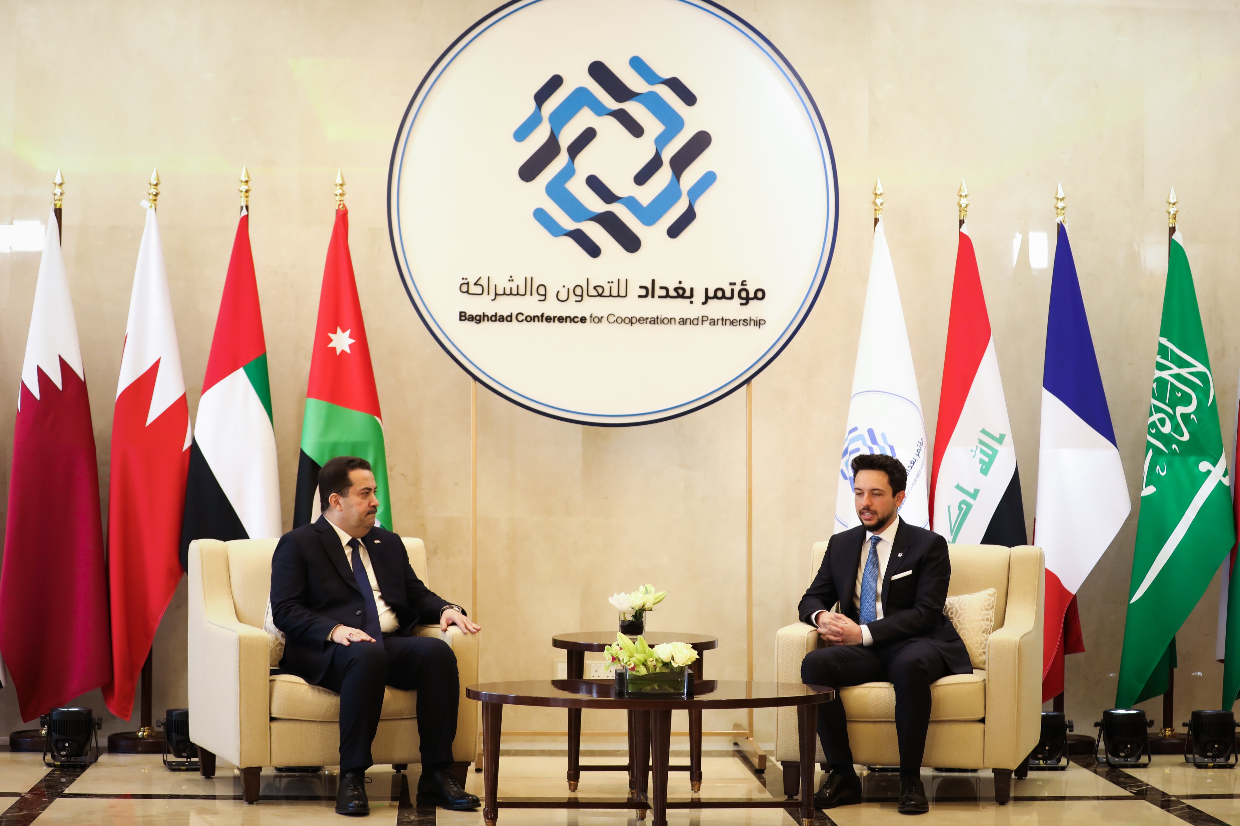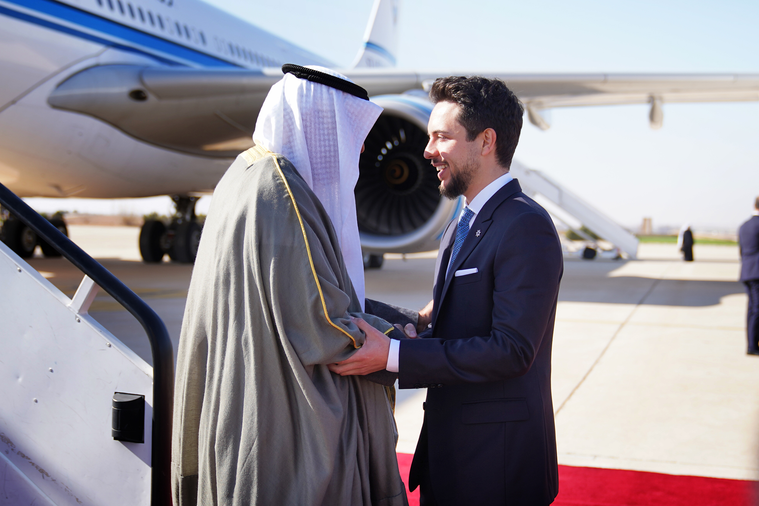 واستقبل سمو الأمير الحسين بن عبدالله الثاني ولي العهد، الثلاثاء، رئيس مجلس الوزراء العراقي محمد شياع السوداني لدى وصوله المملكة، للمشاركة في مؤتمر بغداد للتعاون والشراكة في دورته الثانية الذي يعقد بمنطقة البحر الميت.