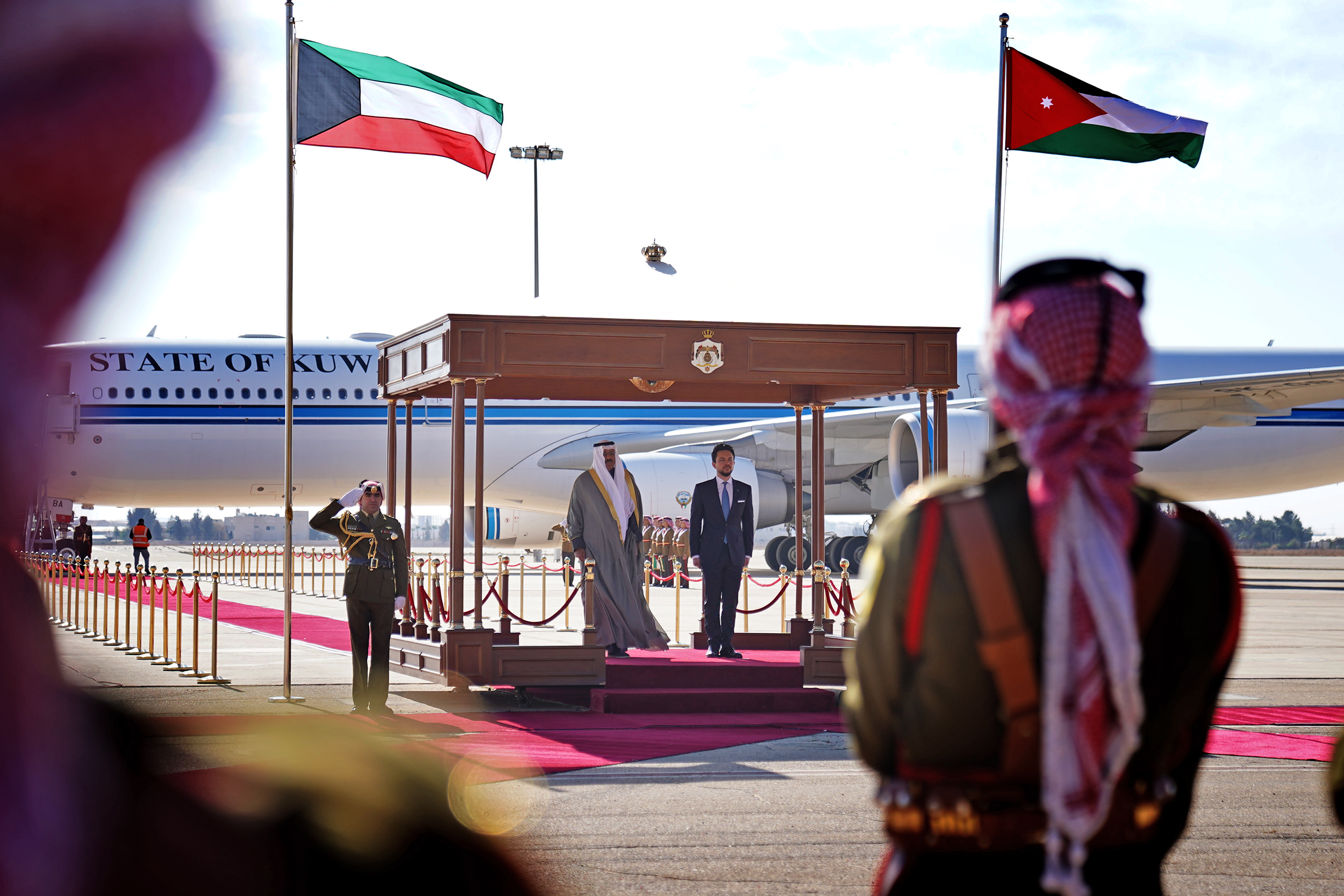 كما كان في الاستقبال بمطار الملكة علياء الدولي رئيس الوزراء الدكتور بشر الخصاونة، وعدد من المسؤولين
