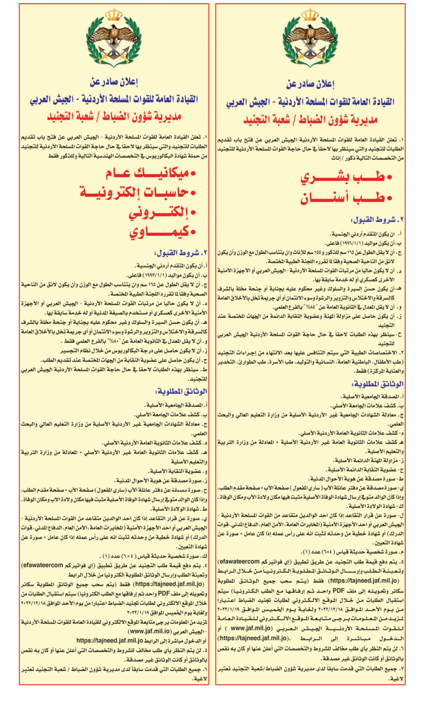 الرأي نيوز - أعلنت القيادة العامة للقوات المسلحة الأردنية – الجيش العربي عن فتح باب تقديم الطلبات للتجنيد في تخصصات الطب البشري وطب الأسنان وميكانيك عام وحاسبات إلكترونية وإلكتروني وكيماوي