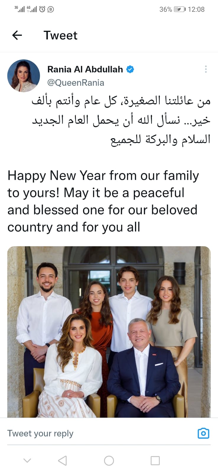 نشرت جلالة الملكة رانيا العبدالله تغريدة على حسابها على تويتر تهنيء الاردنيين بالعام الجديد مرفقة بصورة حديثة كتبت فيها