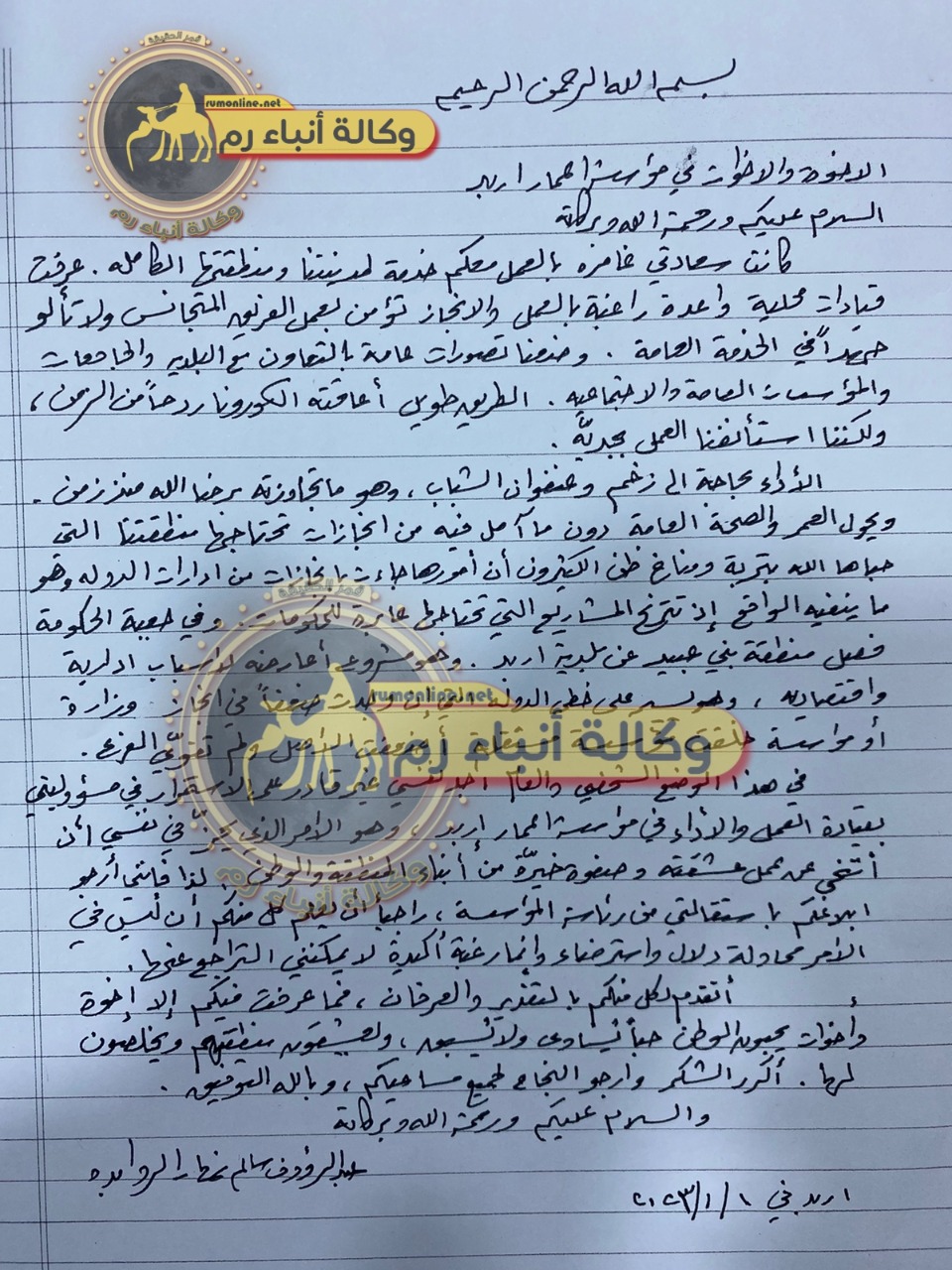وقال الروابدة في استقالته التي تنفرد رم بنشرها " أنه غير قادر على الاستمرار بمسؤوليته بقيادة العمل والأداء في المؤسسة" مضيفا "كانت سعادتي غامرة بالعمل معكم خدمة لمدينتا ومنطقتها الكاملة. عرفت قيادات محلية واعدة راغبة بالعمل والإنجاز تؤمن بعمل الفريق المتجانس ولا تألو جهدا في الخدمة العامة"