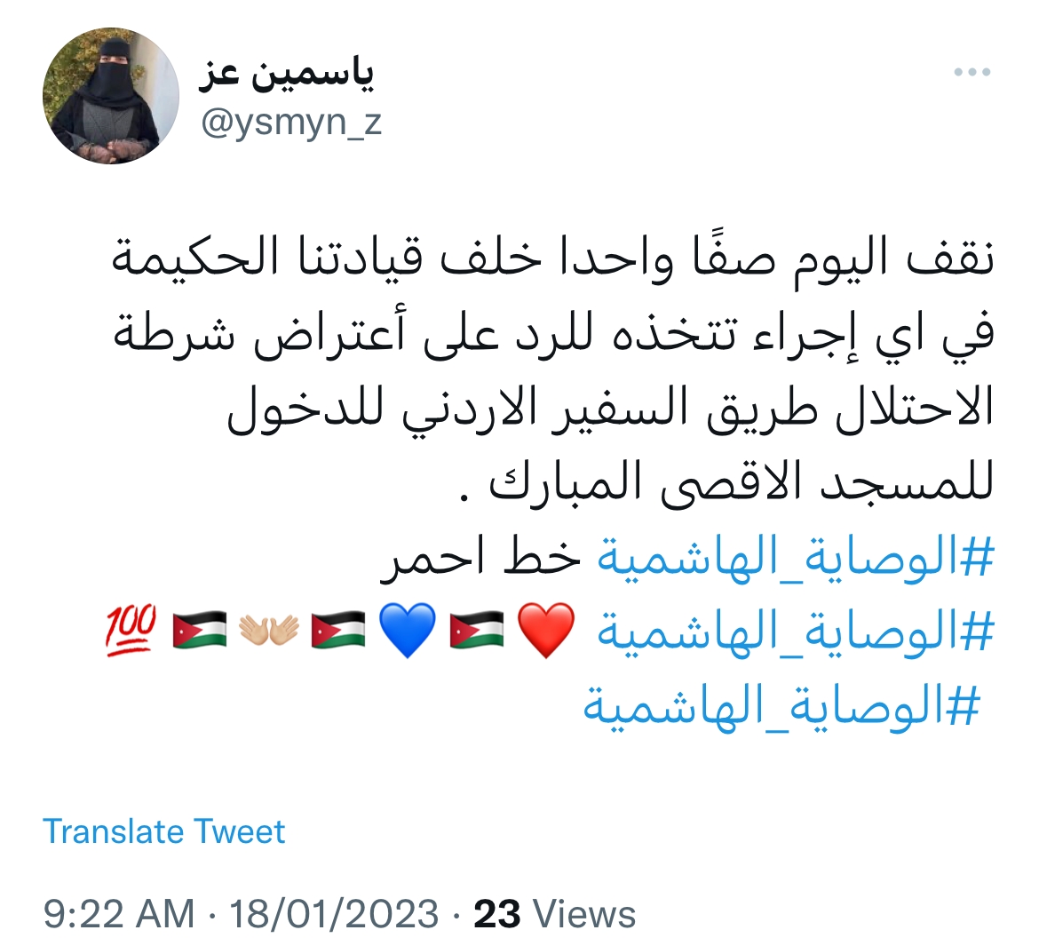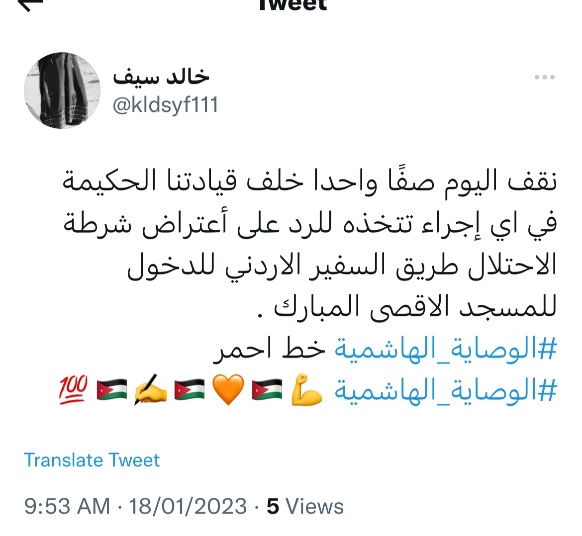 وأكد المغردون على دعمهم للقيادة والحكومة الأرنية في إتخاذ موقف جاد من الإحتلال وطرد السفير الإسرائيلي من الأردن والوقوف أمام سياسات الإحتلال القمعية