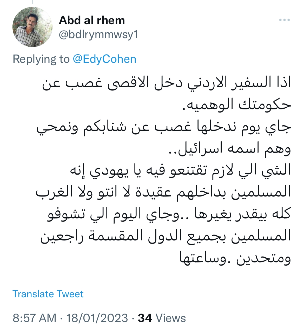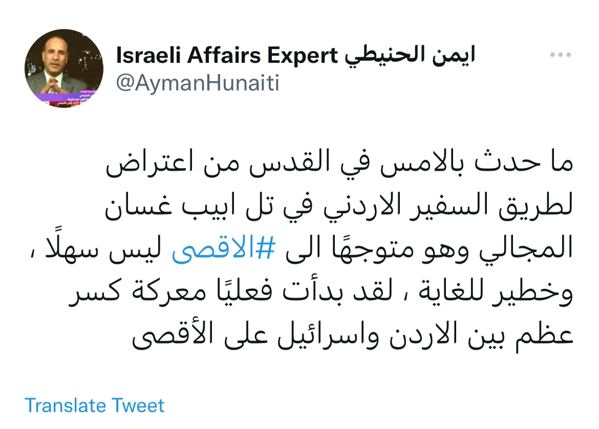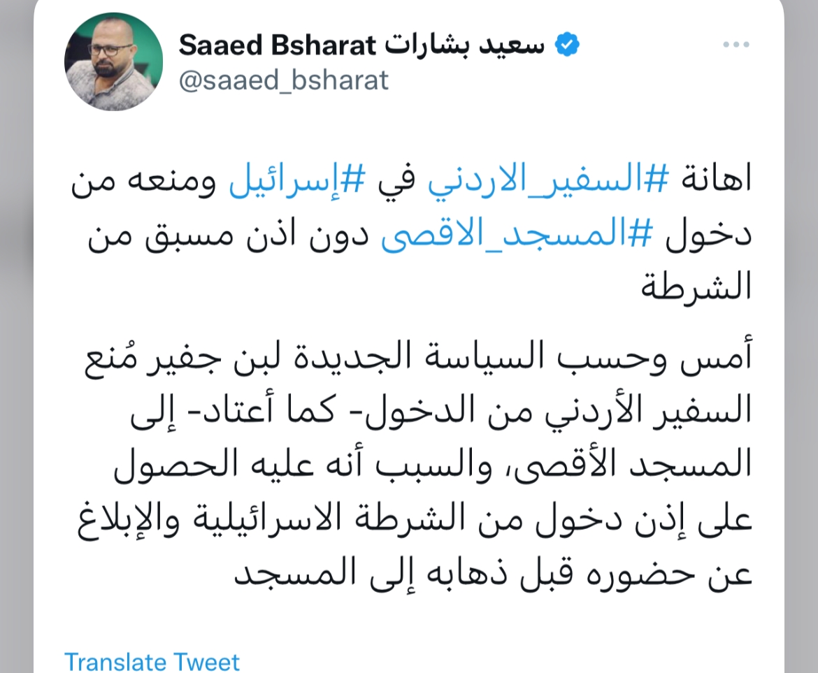 الرأي نيوز - تصدر وسم السفير الأردني منصة تويتر، اليوم الأربعاء، بعد حادثة منعه من دخول المسجد الأقصى ظهر أمس