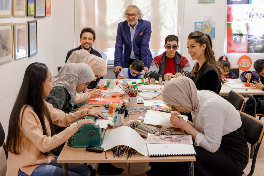زار سمو الأمير الحسين بن عبدالله الثاني، ولي العهد، ترافقه الآنسة رجوة السيف، مبادرة "عبق اللون”، التي تهدف إلى تعليم المكفوفين وذوي الإعاقة البصرية الرسم من خلال التعرف على الألوان عبر حاسة الشم