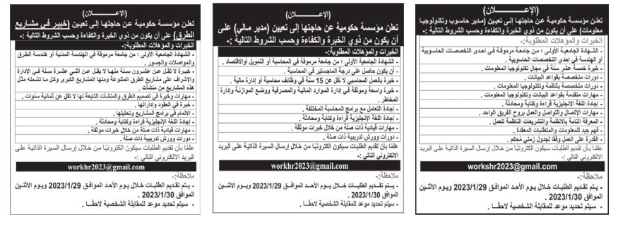 مؤسسات حكومية تعلن حاجتها لملء وظائف شاغرة