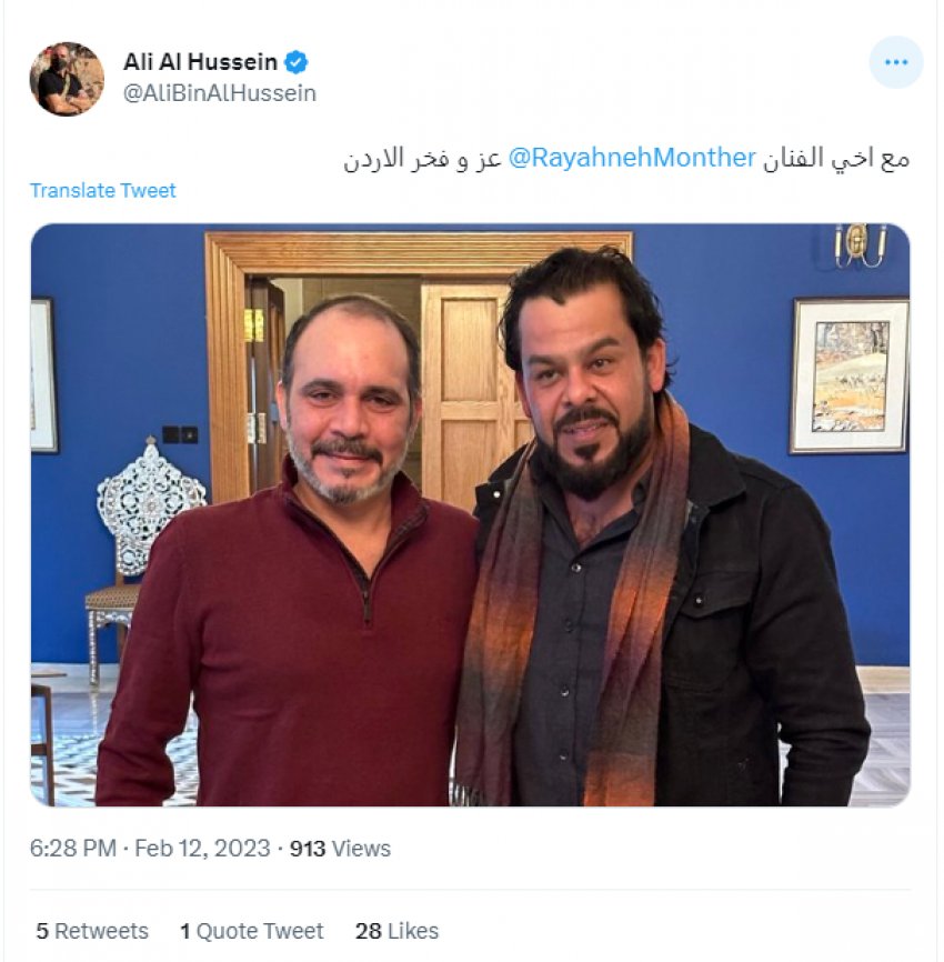 وقال سموه تعليقا على الصورة التي نشرها عبر تويتر، "مع اخي الفنان منذر رياحنة عز وفخر الأردن"