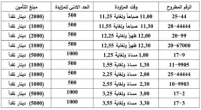 يبدأ المزاد العلني وحسب ما هو مبين بالجدول اعلاه ولإدارة المزاد الموافقة على احالة الرقم المزاود عليه من عدمه باسم المزاود الاخير وحسب مبلغ المزاودة او تمديد وقت المزاد وكذلك ادخال اي شخص للمزاد يرغب بالمزاودة بعد دفع التأمين على الرقم المراد المزاوده عليه خلال عملية المزاودة