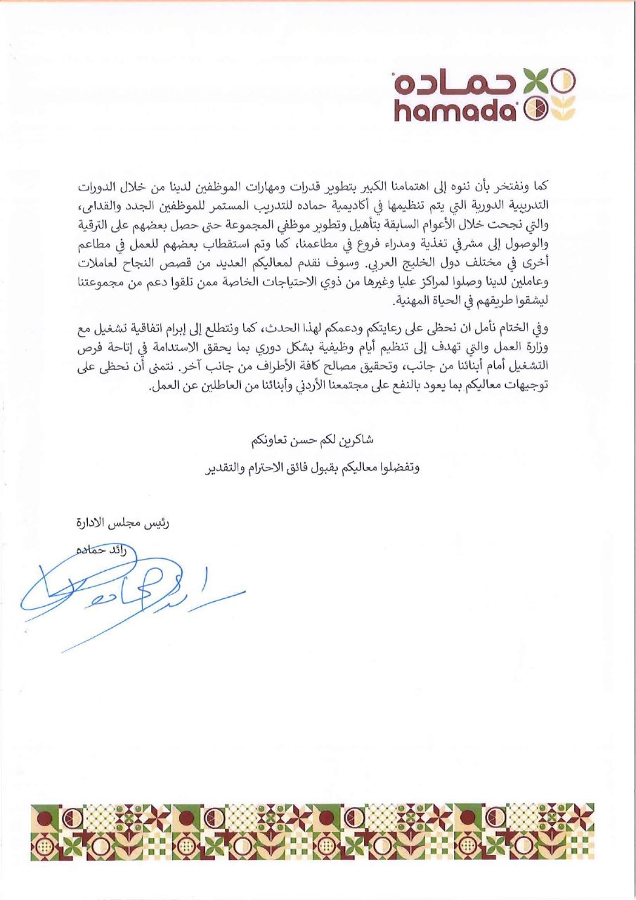 ولفت الى ان مجموعة حماده التي تركز على تشغيل الاردنيين لا تألو جهدا في إعداد كوادر أردنية مؤهلة ومدربة من خلال اكاديمية حماده للتأهيل المستمر
