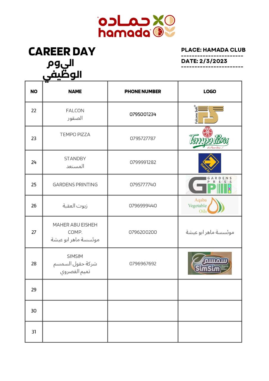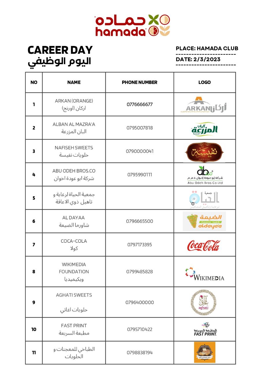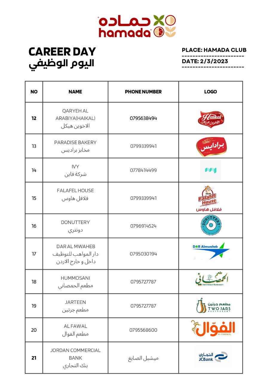 وحسب حماده سيشارك باليوم الوظيفي شركات تعمل في مجال مختلفة منها الاتصالات وتكنولوجيا المعلومات والمطاعم والمواد الغذائية والسياحة