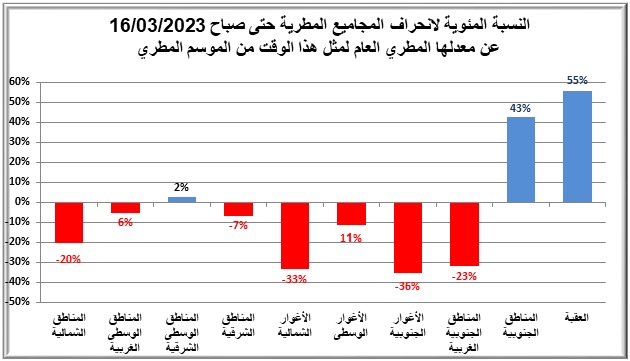الرسم البياني ادناه يبين النسبة المئوية لانحراف المجاميع المطرية حتى صباح 16/03/2023 عن معدلها المطري العام لمثل هذا الوقت من الموسم المطري
