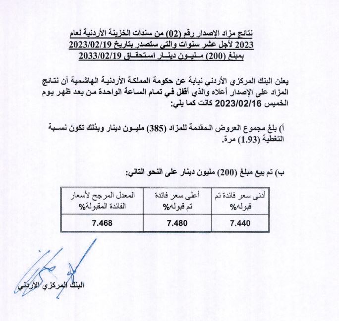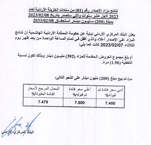 وبحسب التعميم فإن قيمة الإصدار الأول من سندات الخزينة 200 مليون دينار، وتاريخ استحقاقه سيكون في 8/2/2033.