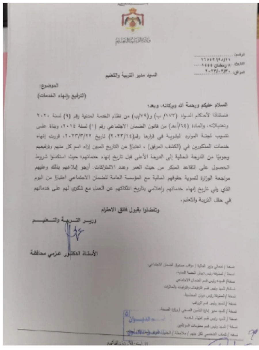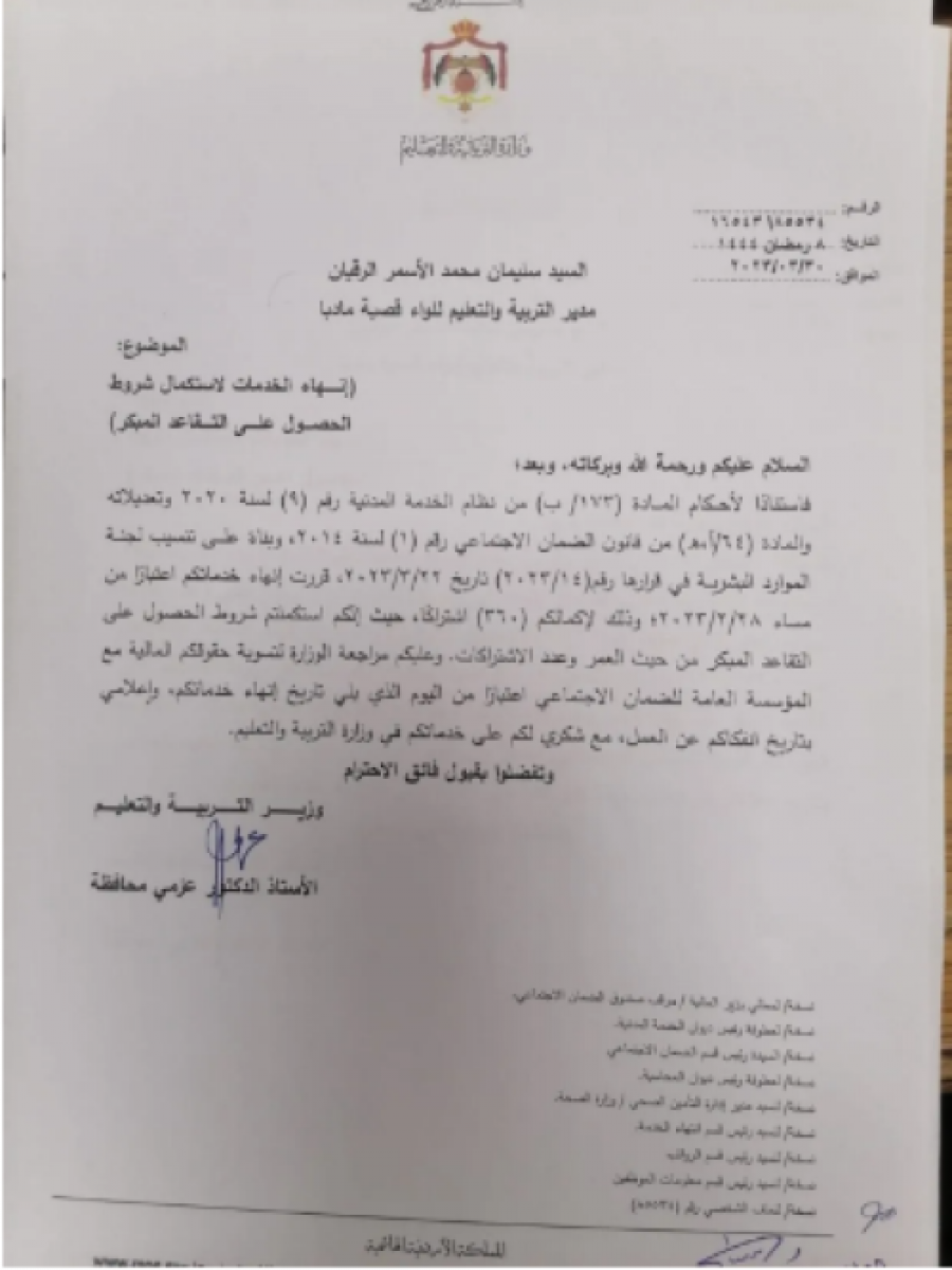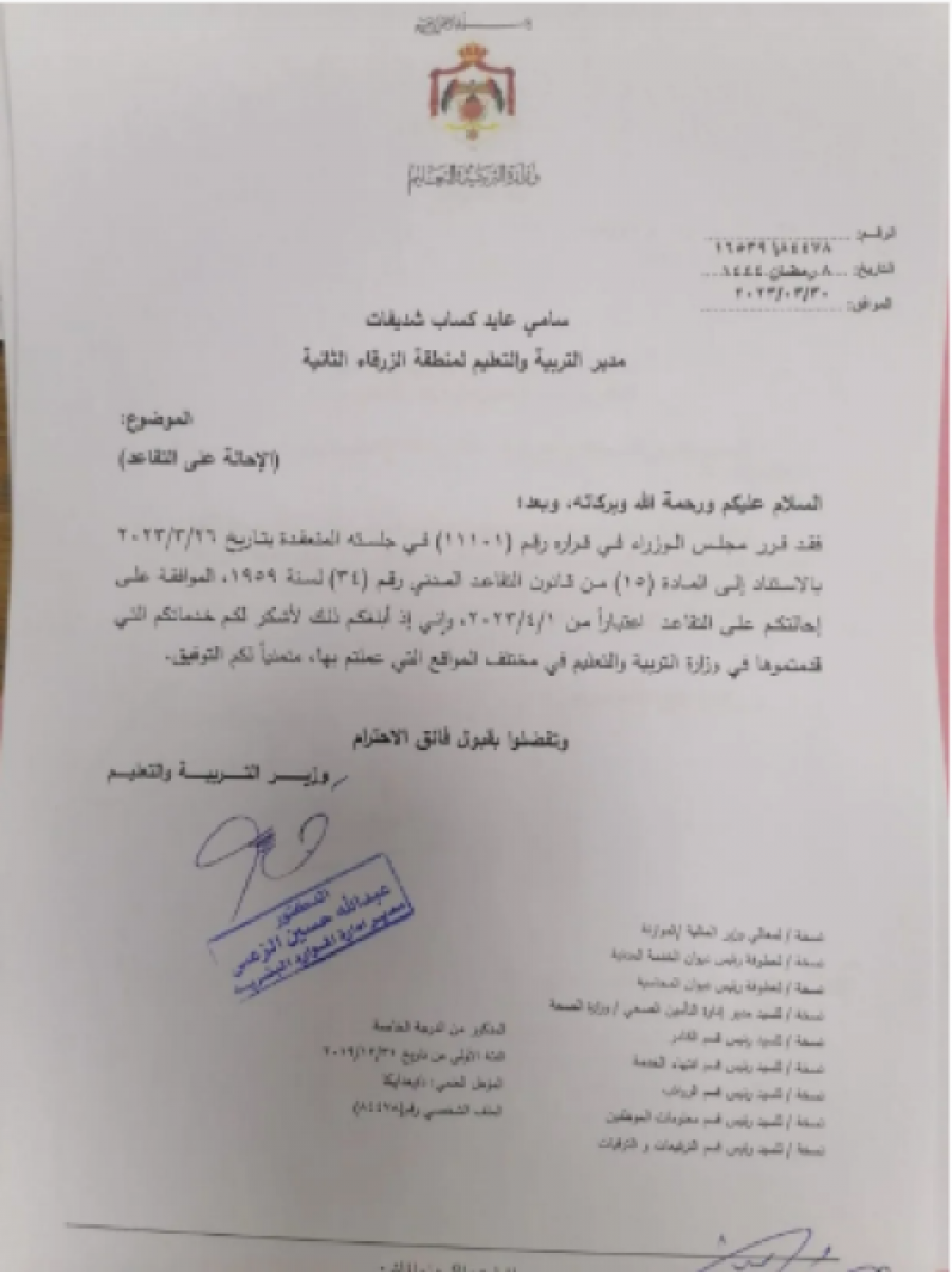 الرأي نيوز  - قرر مجلس الوزراء وبناء على تنسيب وزير التربية والتعليم إحالة 32 موظفا الى التقاعد.