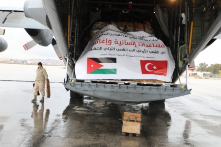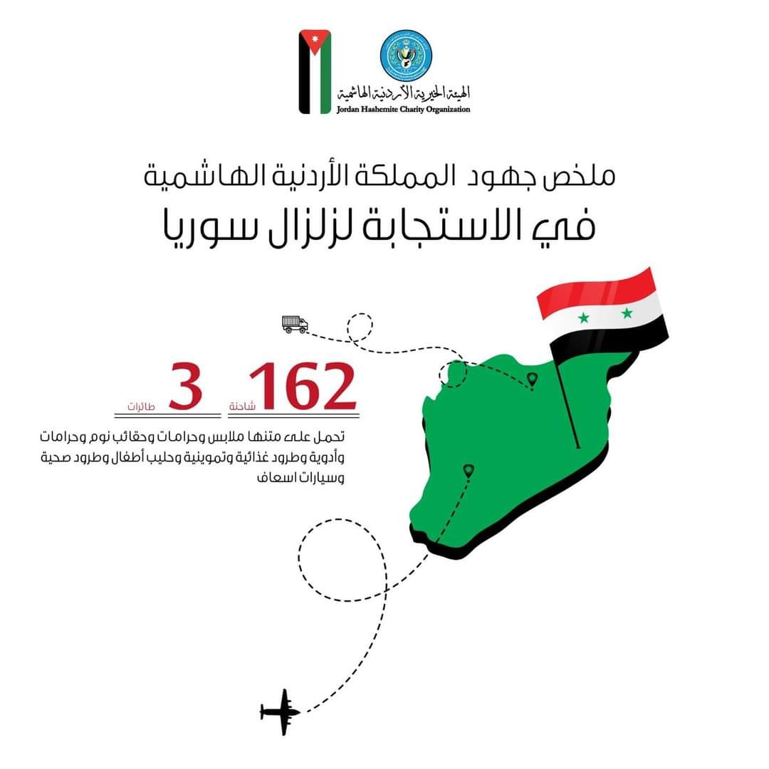 وأضافت أن الأردن أرسل 3 طائرات و162 شاحنة إلى سوريا حملت على متنها؛ ملابس، وحرامات، وحقائب نوم، وأدوية، وطرود غذائية وتموينية، وحليب للأطفال، وطرود صحية، ومركبات إسعاف.