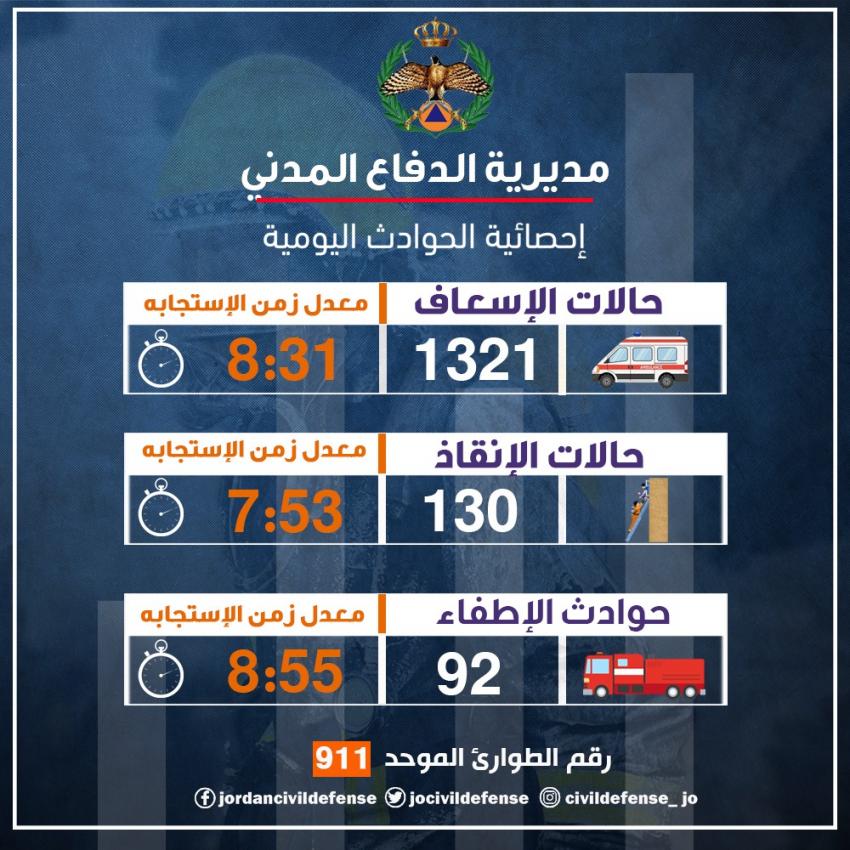 وقالت المديرية عبر فيسبوك، إنه تم التعامل مع (130) حادث إنقاذ وبمعدل زمن الاستجابة (7:53) دقيقة، و(92) حادث إطفاء وبمعدل زمن الاستجابة (8:55)