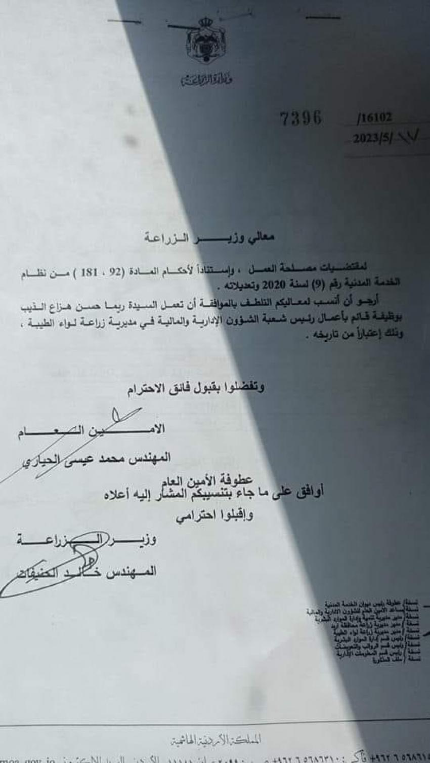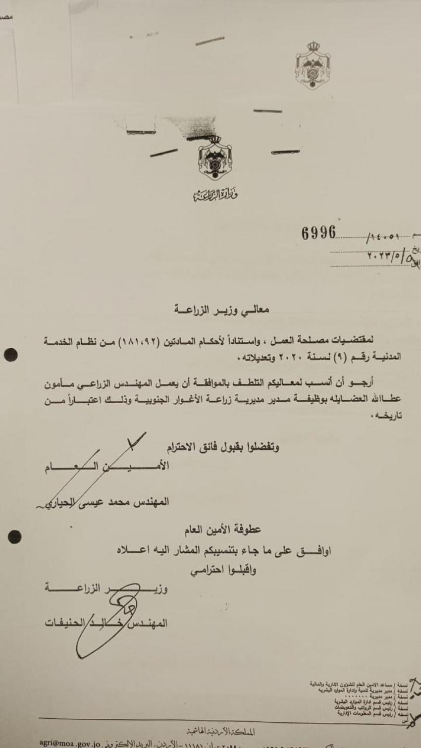 وشملت التشكيلات تعيين مدراء لمديريات زراعة لواء الوسطية وفقوع والاغوار الجنوبية ومديرية الأبنية ورؤساء اقسام وشعب.