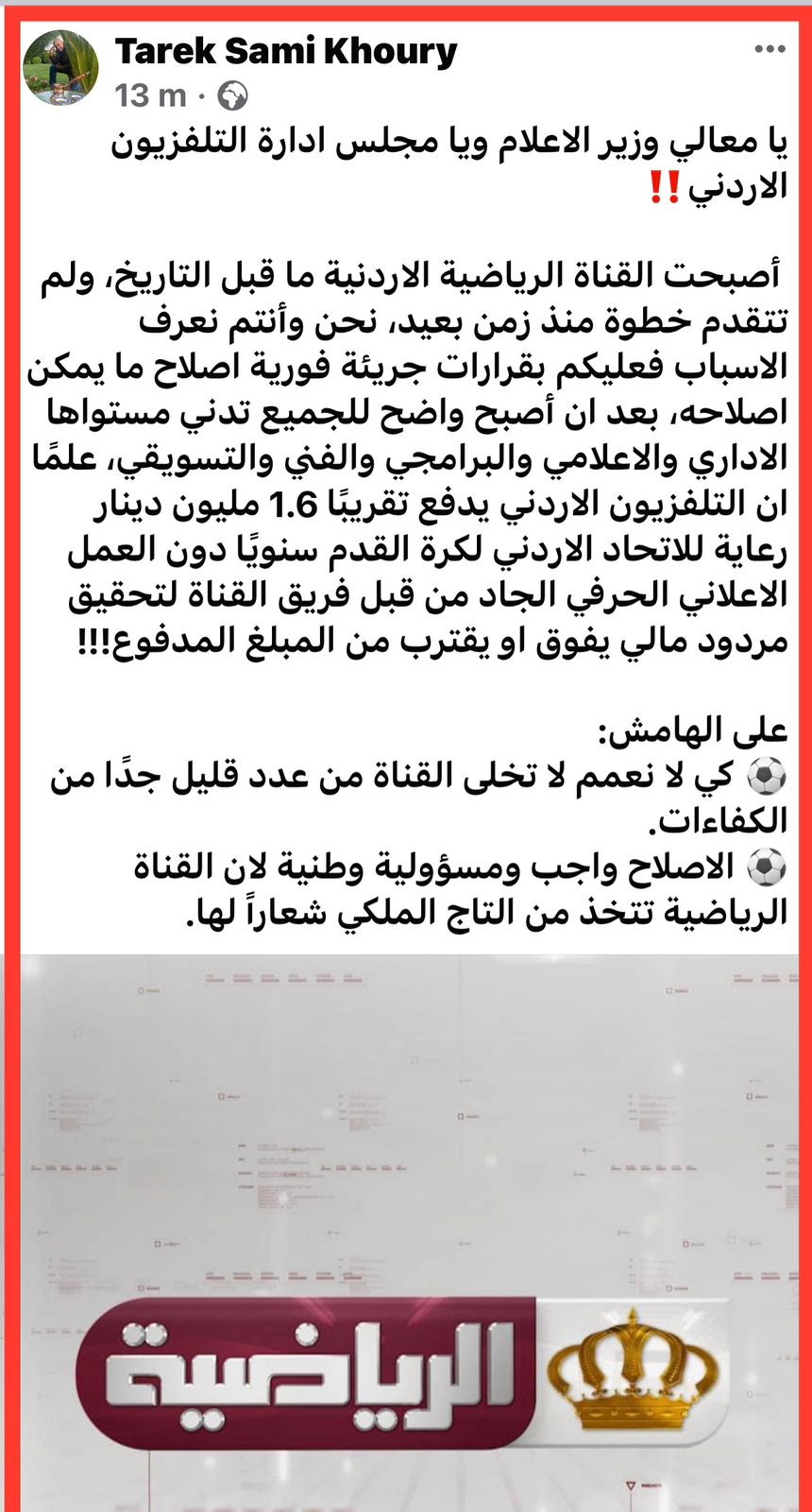 أصبحت القناة الرياضية الاردنية ما قبل التاريخ، ولم تتقدم خطوة منذ زمن بعيد، نحن وأنتم نعرف الاسباب فعليكم بقرارات جريئة فورية اصلاح ما يمكن اصلاحه، بعد ان أصبح واضح للجميع تدني مستواها الاداري والاعلامي والبرامجي والفني والتسويقي، علمًا ان التلفزيون الاردني يدفع تقريبًا 1.6 مليون دينار رعاية للاتحاد الاردني لكرة القدم سنويًا دون العمل الاعلاني الحرفي الجاد من قبل فريق القناة لتحقيق مردود مالي يفوق او يقترب من المبلغ المدفوع!!!
