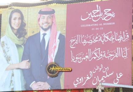 الراي نيوز - بحفل يليق بحجم الفرحة الأردنية الكبيرة، أقام النائب علي سليمان الغزاوي احتفالا جماهيريا ضخما لعشائر الأغوار الشمالية، بمناسبة زفاف سمو الأمير الحسين على الآنسة رجوة آل سيف.