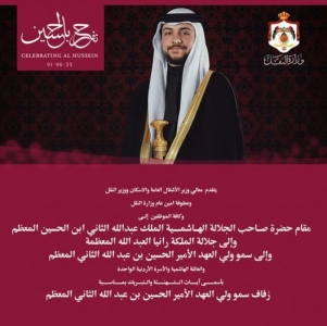 الرأي نيوز  - يتقدم وزير الاشغال العامة والإسكان ووزير النقل وامين عام وزارة النقل موظفين الوزارة الى مقام حضرة صاحب الجلالة الملك عبدالله الثاني بن الحسين المعظم وجلالة الملكة رانيا العبدالله المعظمة وسمو ولي العهد الأمير الحسين بن عبدالله الثاني والعائلة الهاشمية والاسرة الاردنية الواحدة بأسمى آيات التهنئة والتبريك بمناسبة حفل زفاف سمو ولي العهد الأمير الحسين بن عبدالله الثاني المعظم.