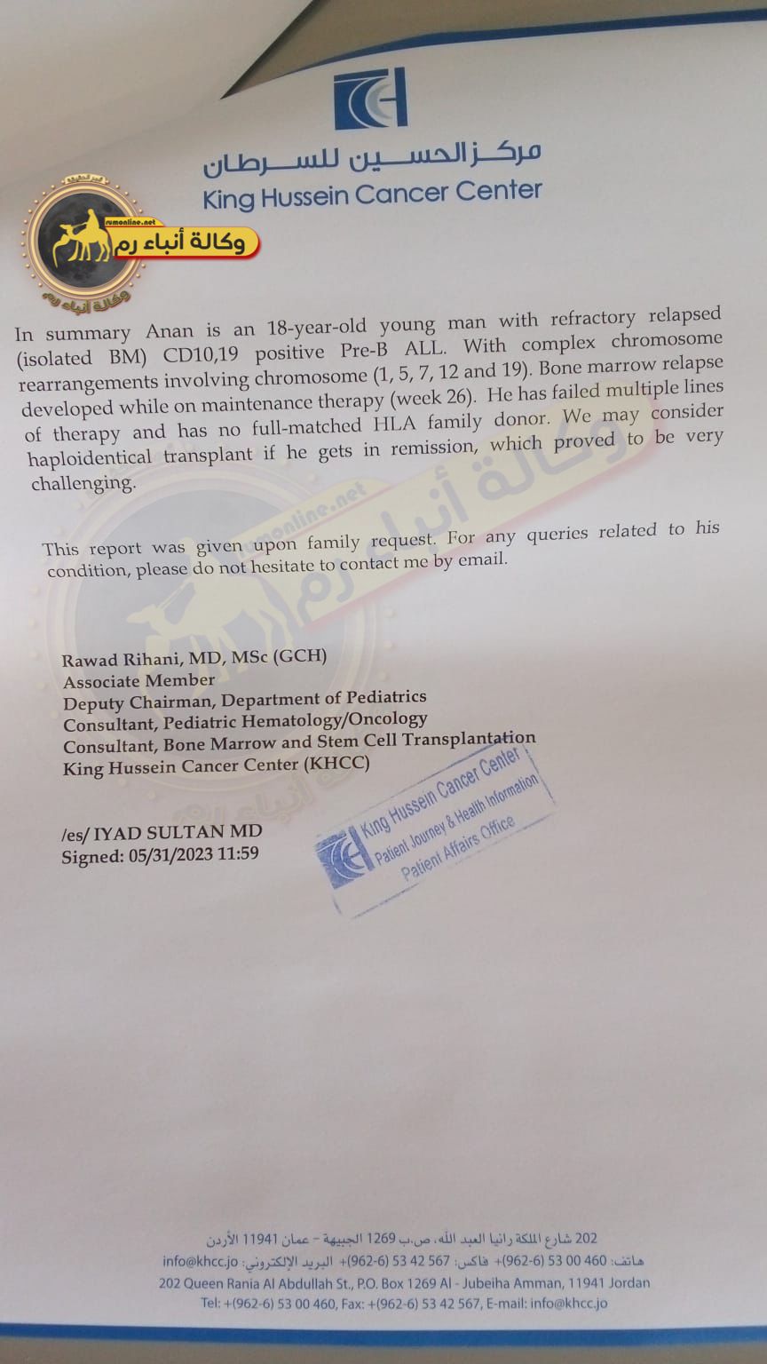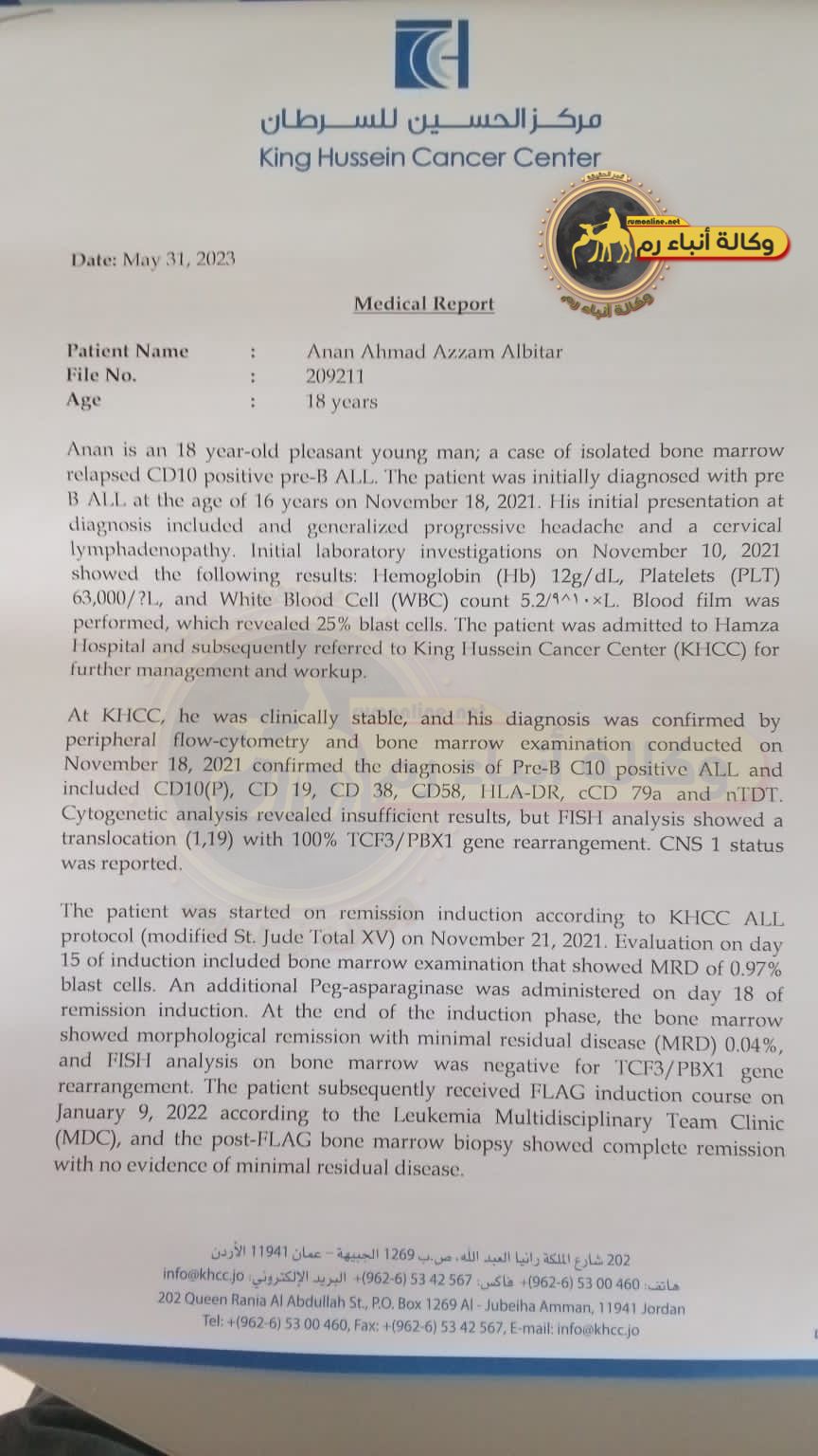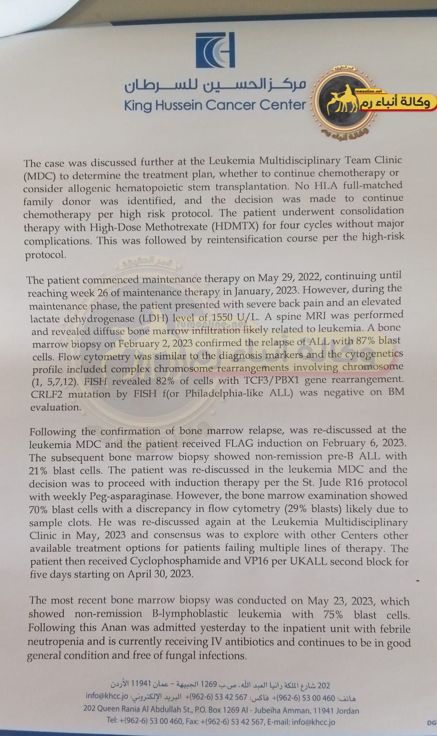 وأضاف والده أن أخر خطة للعلاج إقترحتها طبيبته في مركز الحسين للسرطان كانت زراعة للنخاع الشوكي من قريب ذات صلة ولإجراء هذه العملية عليه الخضوع لجلسات كيماوي لتنظيف الخلايا إلا أنه تعرض لإنتكاسه ولم تستجيب هذه الخلايا للعلاجات المتوفرة.