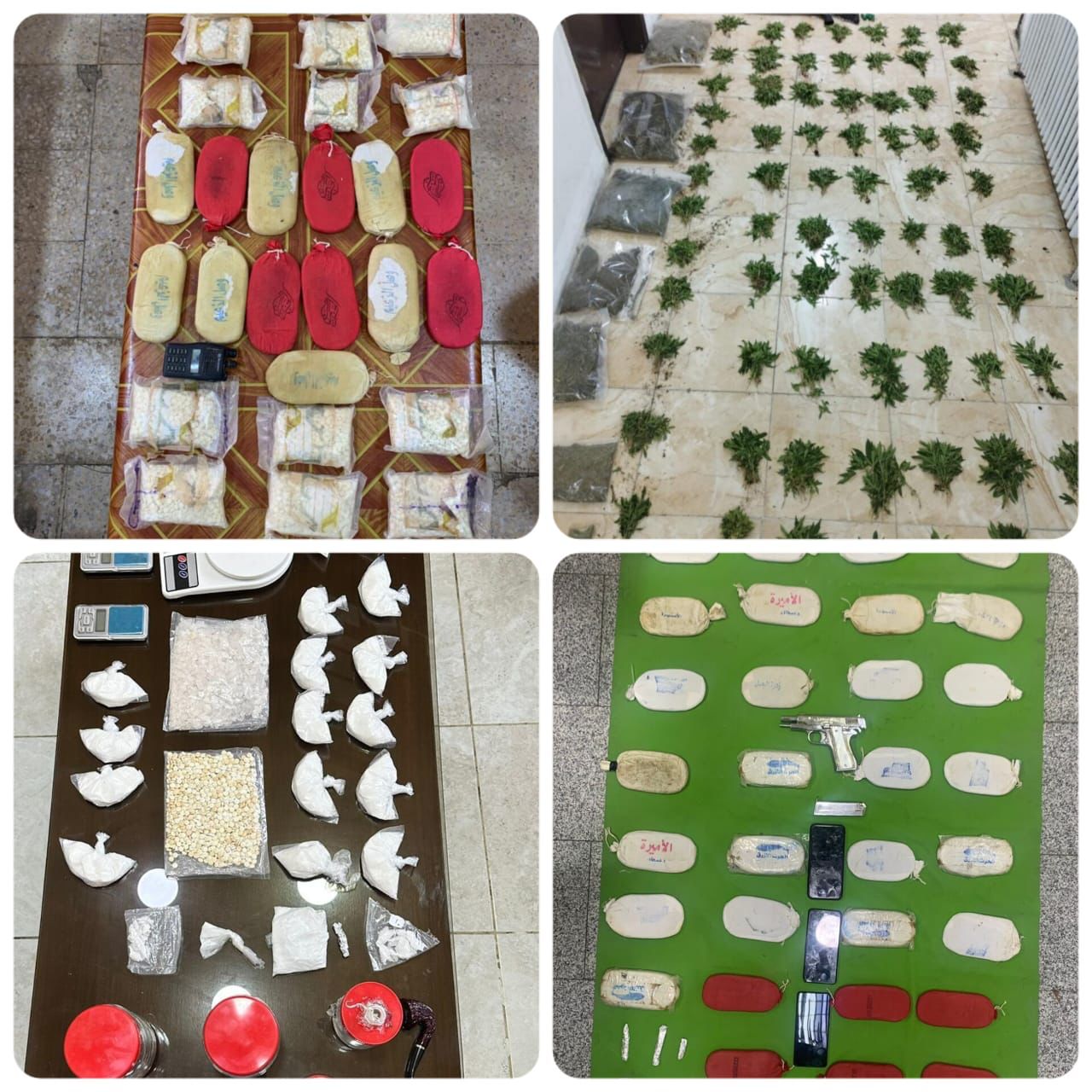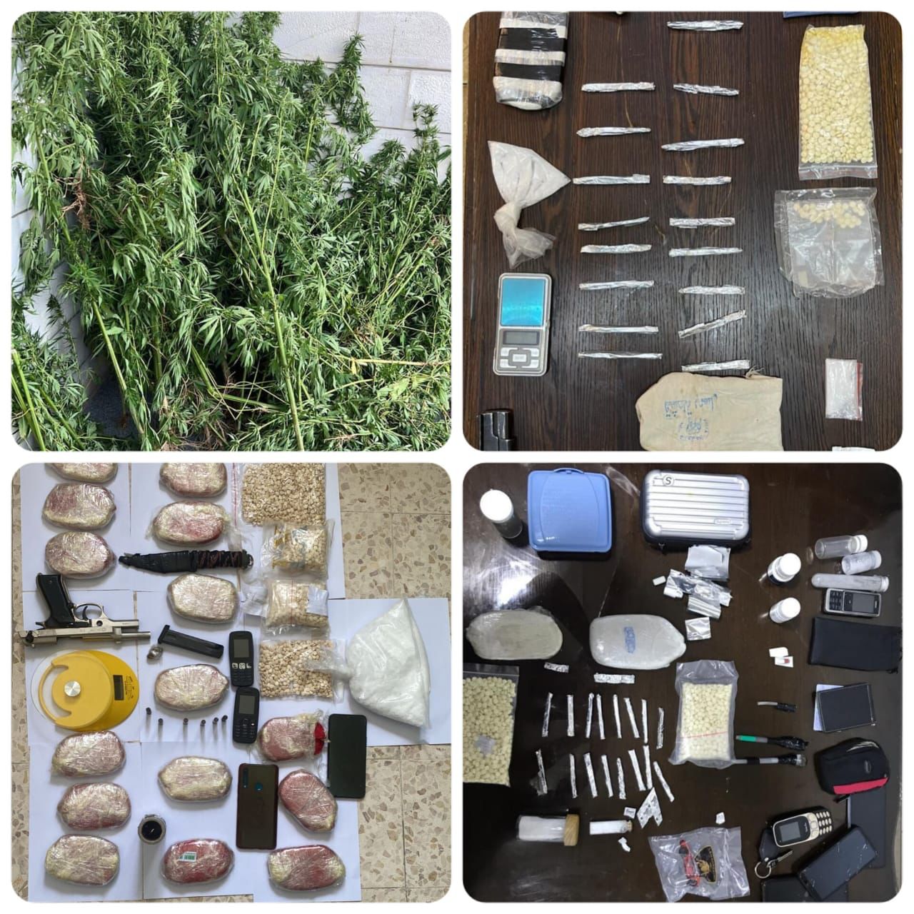 وفي محافظة معان القي القبض على اربعة تجار ومروجين خلال التعامل مع قضيتين في الاولى جرت مداهمة وضبط ثلاثة اشخاص وبحوزتهم 4 كفوف حشيش وسلاح ناري كما والقي القبض على تاجر في القضية الثانية وضبط بحوزته 2000 حبة مخدرة وسلاح ناري ، وفي محافظة الكرك دوهمت خيمة استخدمها احد الاشخاص لزراعة اشتال الماريجوانا المخدرة والقي القبض عليه وضبطت كميات من اشتال الماريجوانا المزروعة ،كما والقي القبض في محافظة الطفيلة على مروجين اثنين وبحوزتهما 5 كفوف حشيش.