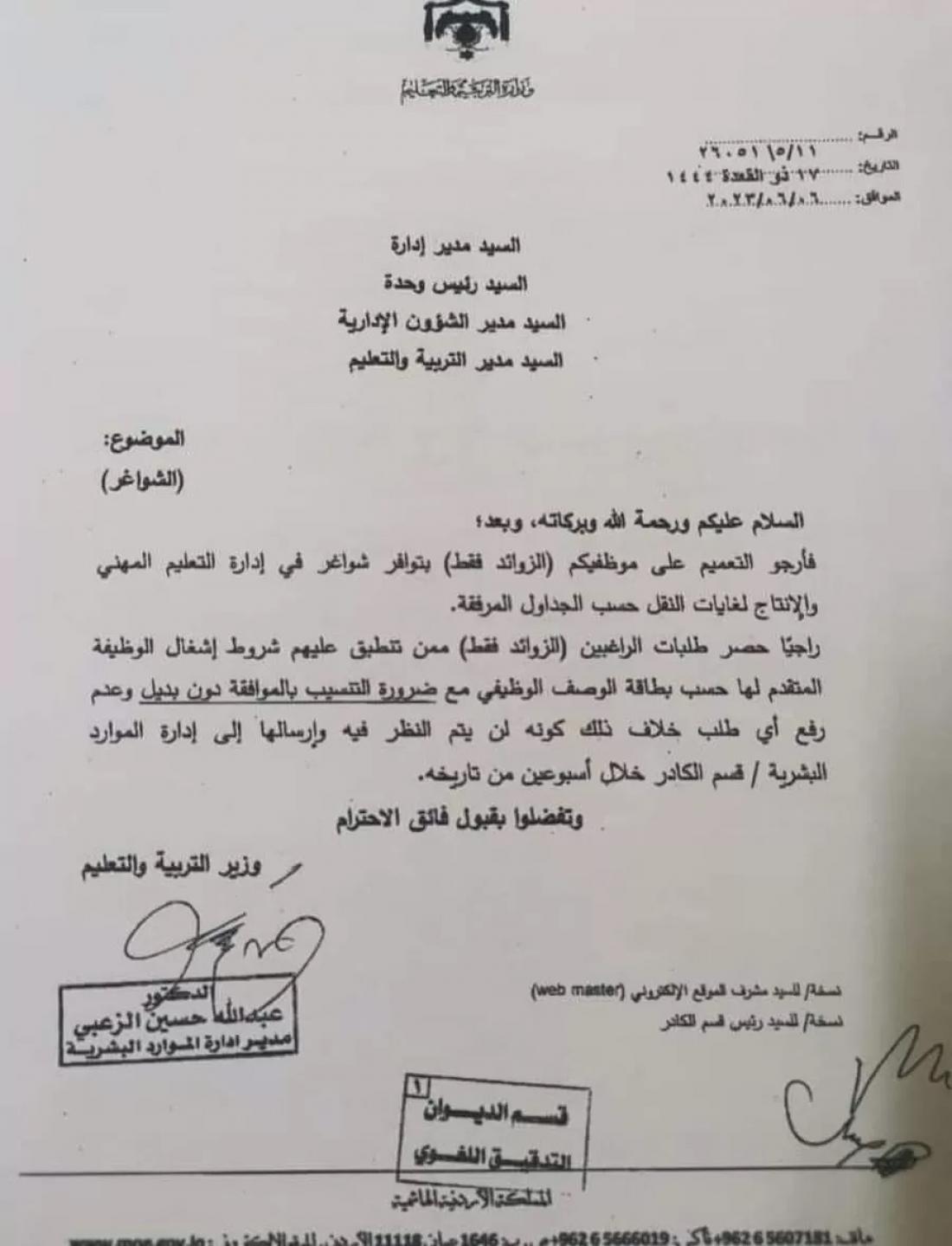 ووفق كتاب للوزارة، رجت الوزارة من إداراتها ووحداتها ومديرياتها حصر طلبات الراغبين من "الزوائد فقط” ممن تنطبق عليهم شروط إشغال الوظيفة المتقدم لها حسب الوصف الوظيفي، مع ضرورة التنسيب بالموافقة دون بديل وعدم رفع أي طلب خلاف ذلك كونه لن يتم النظر فيه.