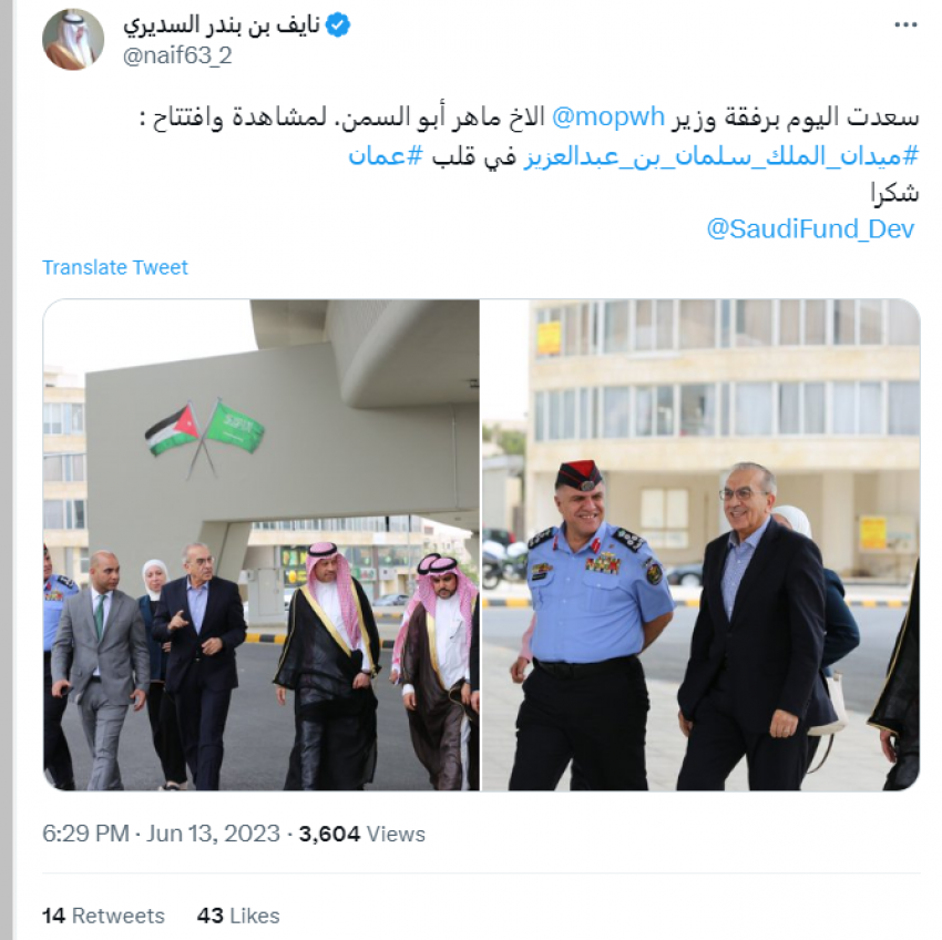 وقال السديري في تغريدة له عبر تويتر، " سعدت اليوم برفقة وزير الأشغال العامة والإسكان المهندس الأخ ماهر أبو السمن لمشاهدة وافتتاح: ميدان الملك سلمان بن عبدالعزيز في قلب عمان. شكرا للصندوق السعودي للتنمية".
