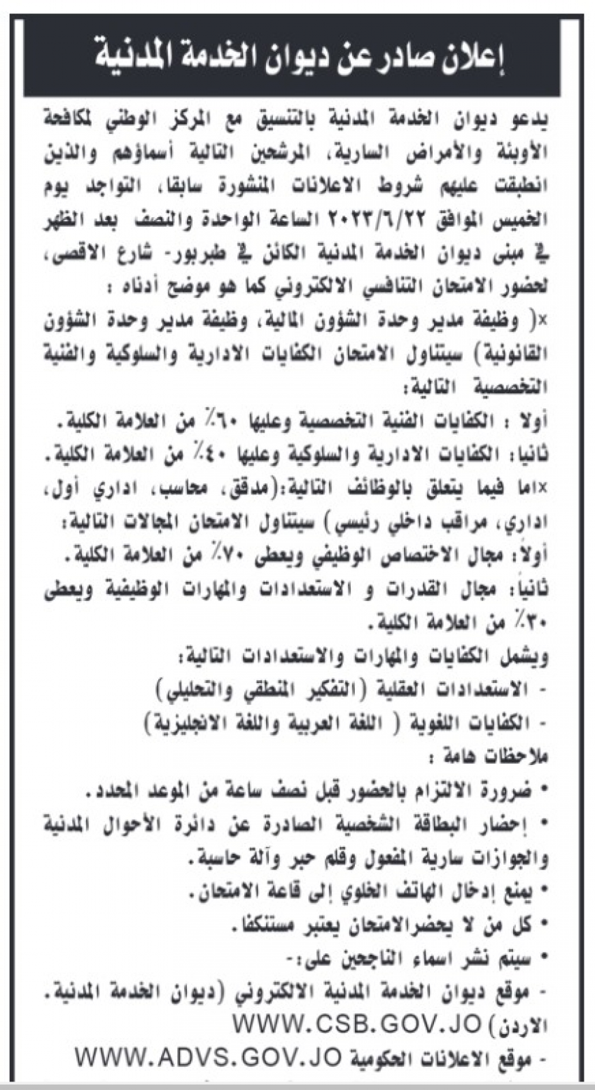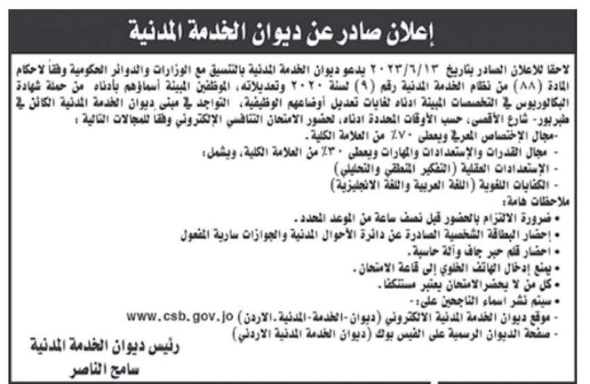 الراي نيوز - دعا ديوان الخدمة المدنية المرشحين المدرجة أسماؤهم أدناه لإجراء الامتحان التنافسي الالكتروني في عدة شواغر حكومية .