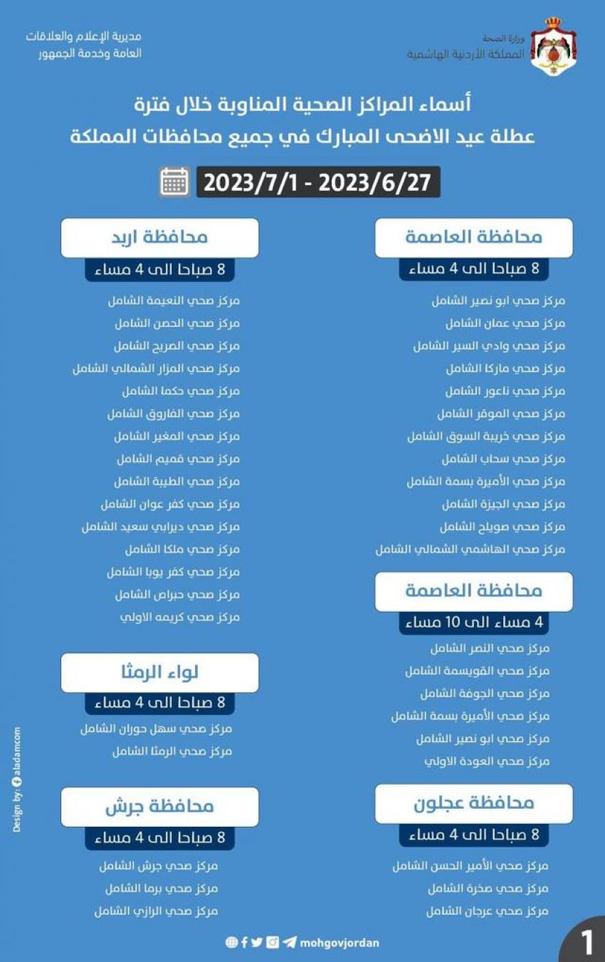الرأي نيوز  - أعلنت وزارة الصحة اليوم الاثنين أسماء مراكزها الصحية المناوبة في كافة المحافظات خلال فترة عطلة عيد الأضحى المبارك والبالغ عددها 115 مركزا صحيا شاملاً وأولياً.