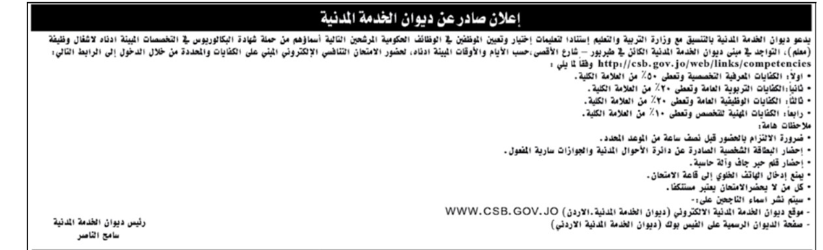 الرأي نيوز- دعا ديوان الخدمة المدنية، بالتنسيق مع وزارة التربية والتعليم، عدداً من المرشحين للامتحان التنافسي لإشغال وظيفة معلم.