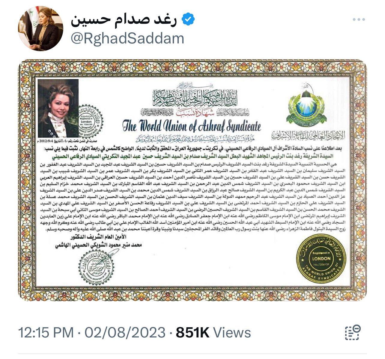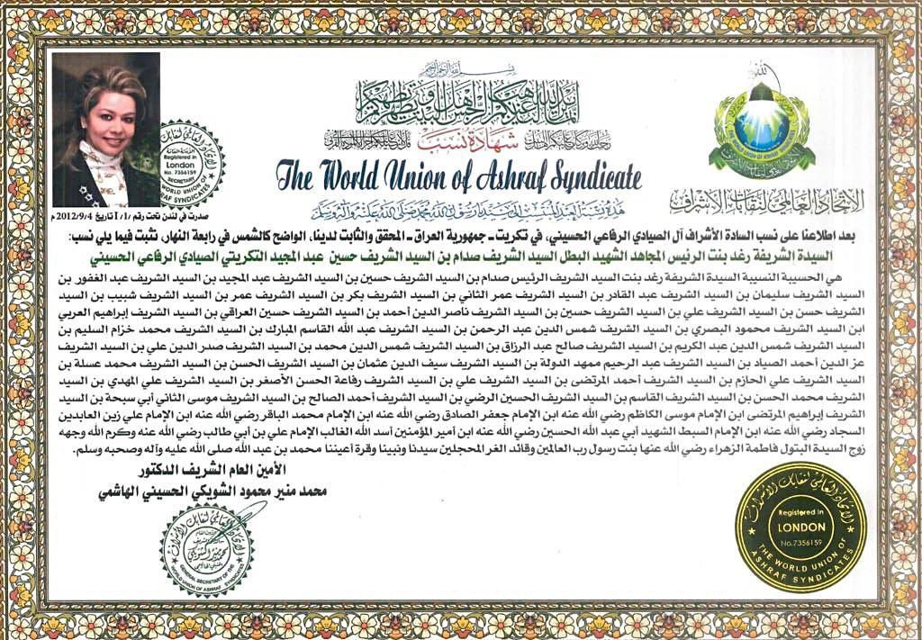 رغد صدام حسين تنشر شهادة نسبها - شاهد