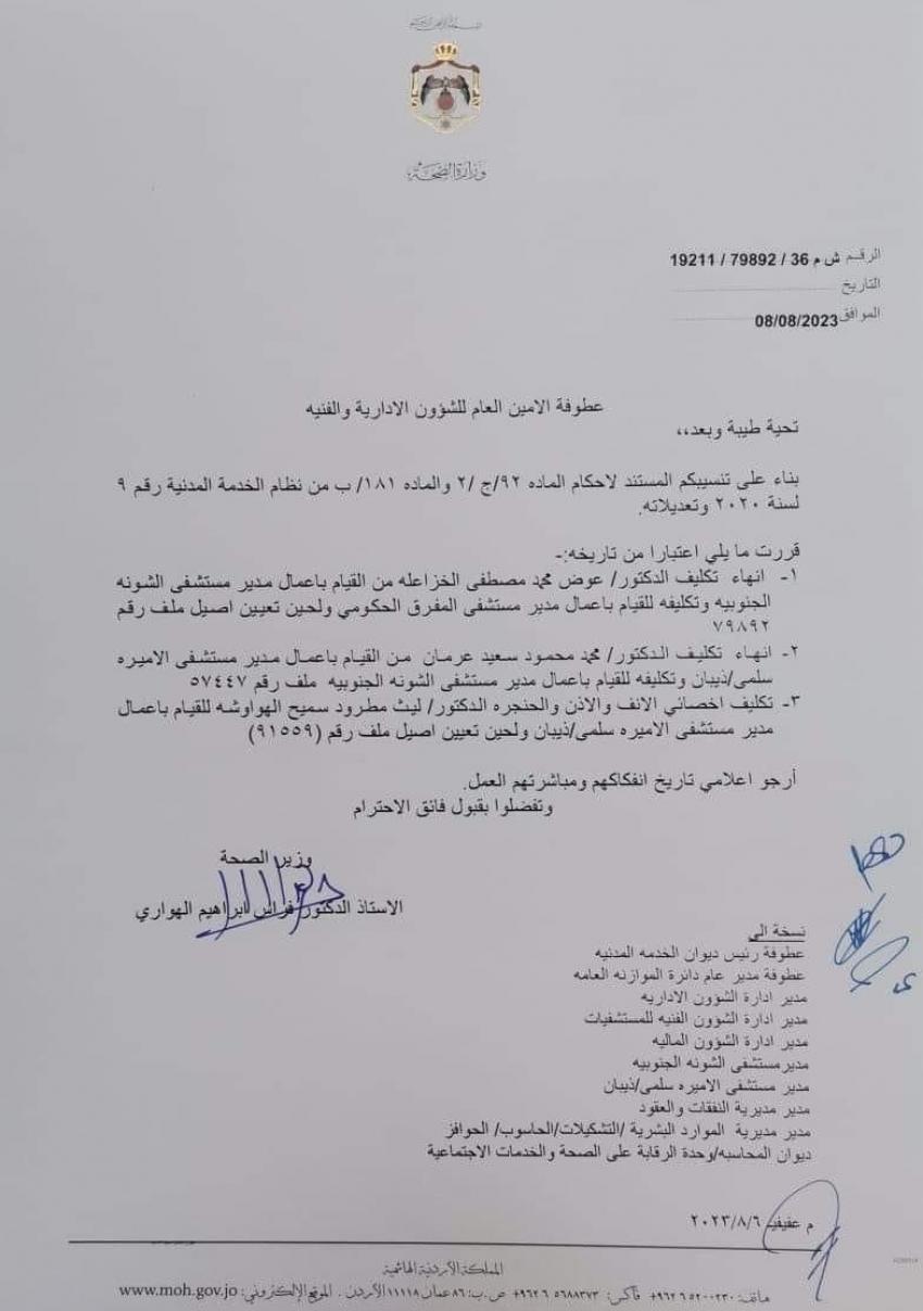وشملت التشكيلات نقل وتكليف اطباء للقيام باعمال مدراء مستشفيات المفرق والشونة الجنوبية والاميرة سلمى.