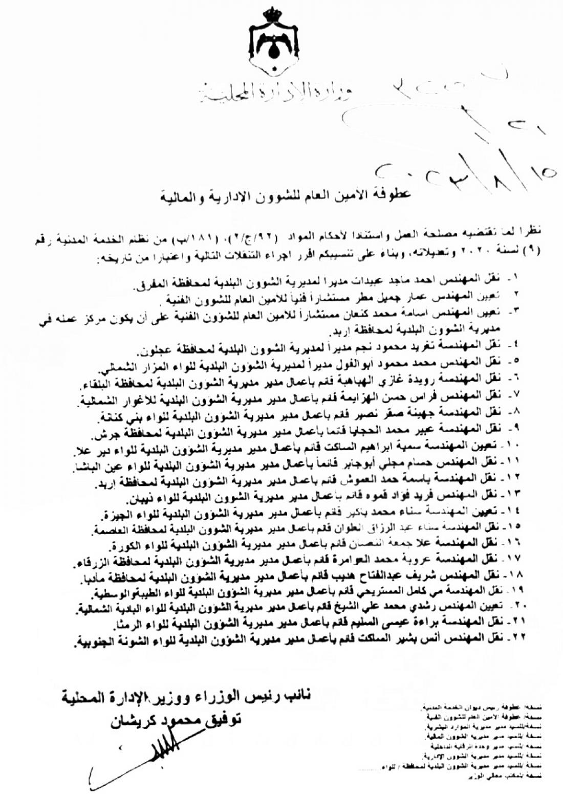 وشملت التشكيلات نقل 22 مهندسا وتعيينهم مدراء لمديريات الشؤون البلدية في محافظات المملكة.