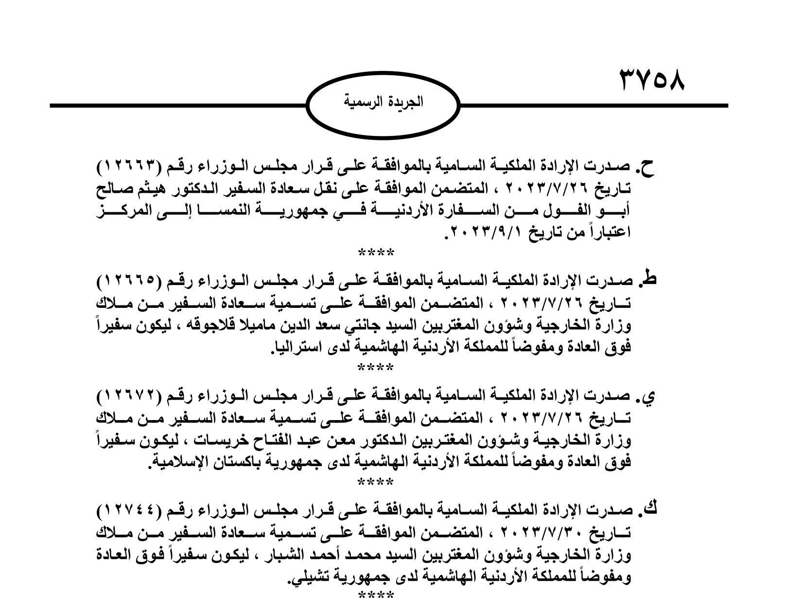 صدر في عدد الجريدة الرسمية اليوم الاربعاء، الإرادات الملكية السامية بنقل وتسمية 10 سفراء.