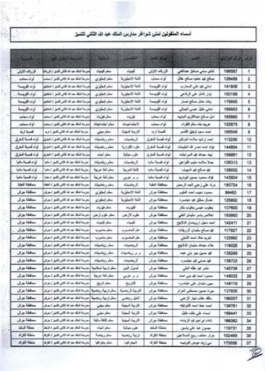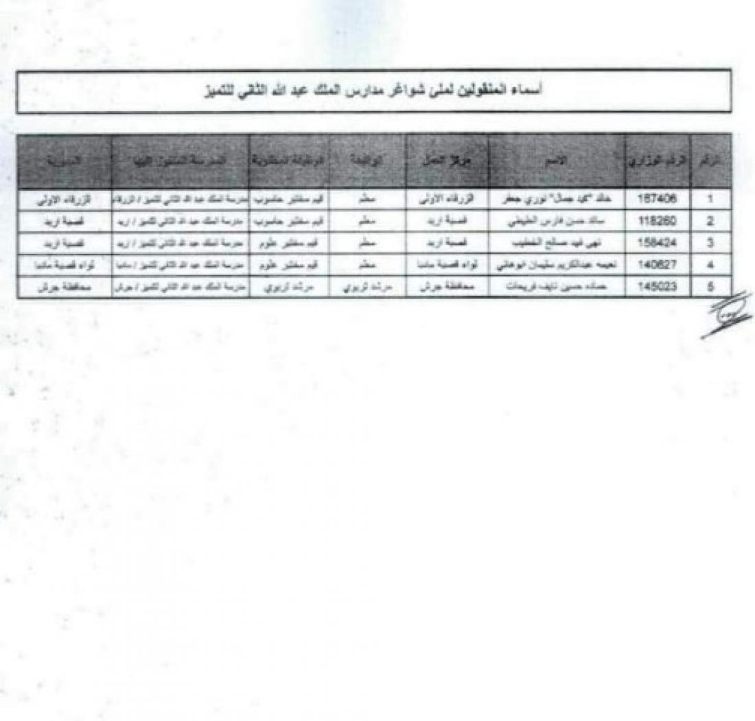 الراي نيوز  - أعلنت وزارة التربية والتعليم عن قائمة الموظفين المنقولين إلى مدارس الملك عبدالله الثاني للتميز وفقا لكتاب .