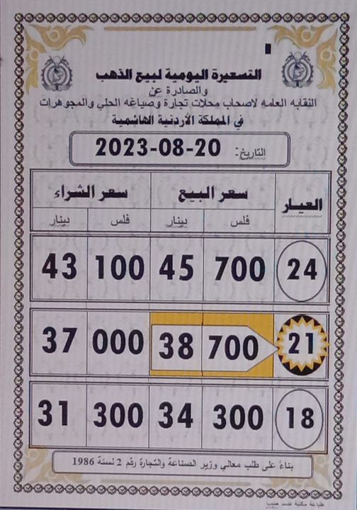 وبلغ سعر غرام الذهب من عيار 21، الأكثر طلبا لدى الأردنيين، 38.70 دينارا لجهة الشراء من المحال، فيما بلغ 37.00 دينار لجهة البيع.