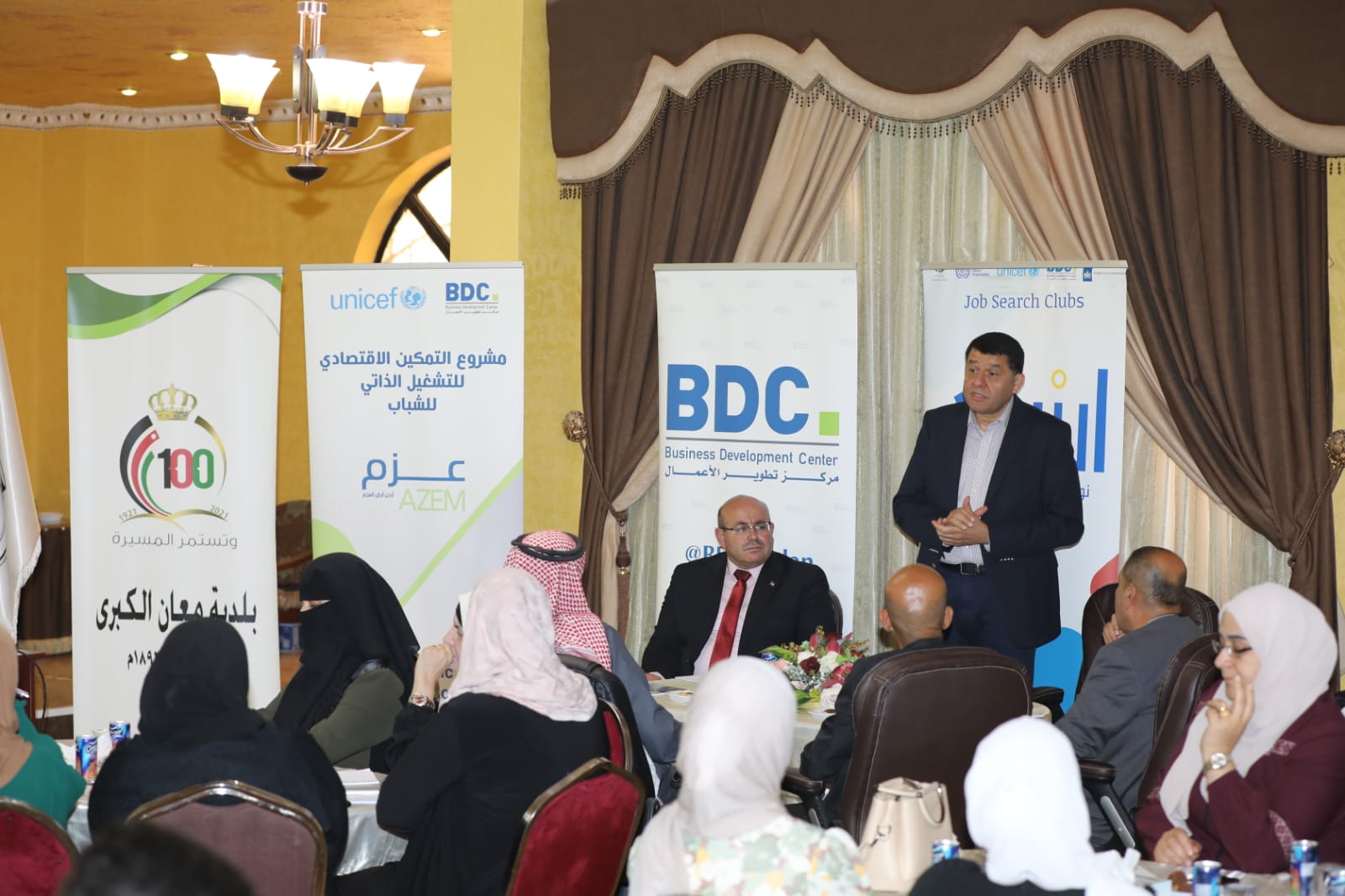 BDC أثناء الجلسات المجتمعية التي عقدها مركز تطوير الأعمال BDC في محافظة معان بحضور رئيس بلدية معان ياسين صلاح أن المركز الذي تأسس عام ٢٠٠٤ كمؤسسة غير ربحية تتركز رؤيته ورسالته في المساهمة بتحقيق الرؤى الملكية والتطلعات الحكومية في توفير فرص التشغيل والتشغيل الذاتي للفئات العمرية الشابة من خلال إطلاق مبادرات تركز في مخرجاتها على موائمة متطلبات سوق العمل وتعزيز مفهوم الريادة والإبداع لخلق مشاريع تسهم في التنمية الاقتصاديه، تماشيا مع رؤية التحديث الاقتصادي وادماج المجتمعات ومؤسسات المجتمع المحلي لإحداث التنمية المستدامه.