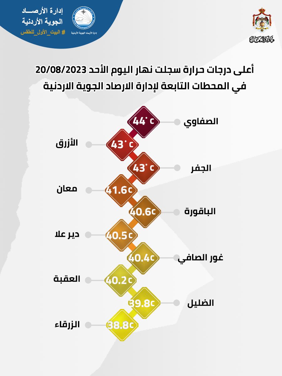 وذكرت الأرصاد الجوية في منشور لها، عبر فيسبوك، أن محطتي الأزرق سجلت 43 درجة، تلتها الجفر بذات مستوى درجة الحرارة.