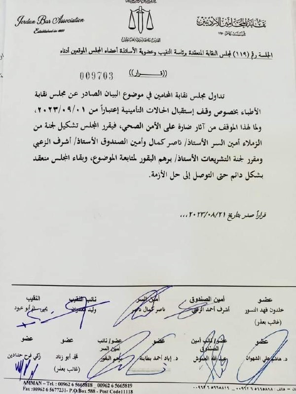 الرأي نيوز  - قرر مجلس نقابة المحامين، تشكيل لجنة من أعضاء في مجلس النقابة لمتابعة قرار نقابة الأطباء بخصوص وقف استقبال الحالات التأمينية اعتباراً من مطلع الشهر المقبل.