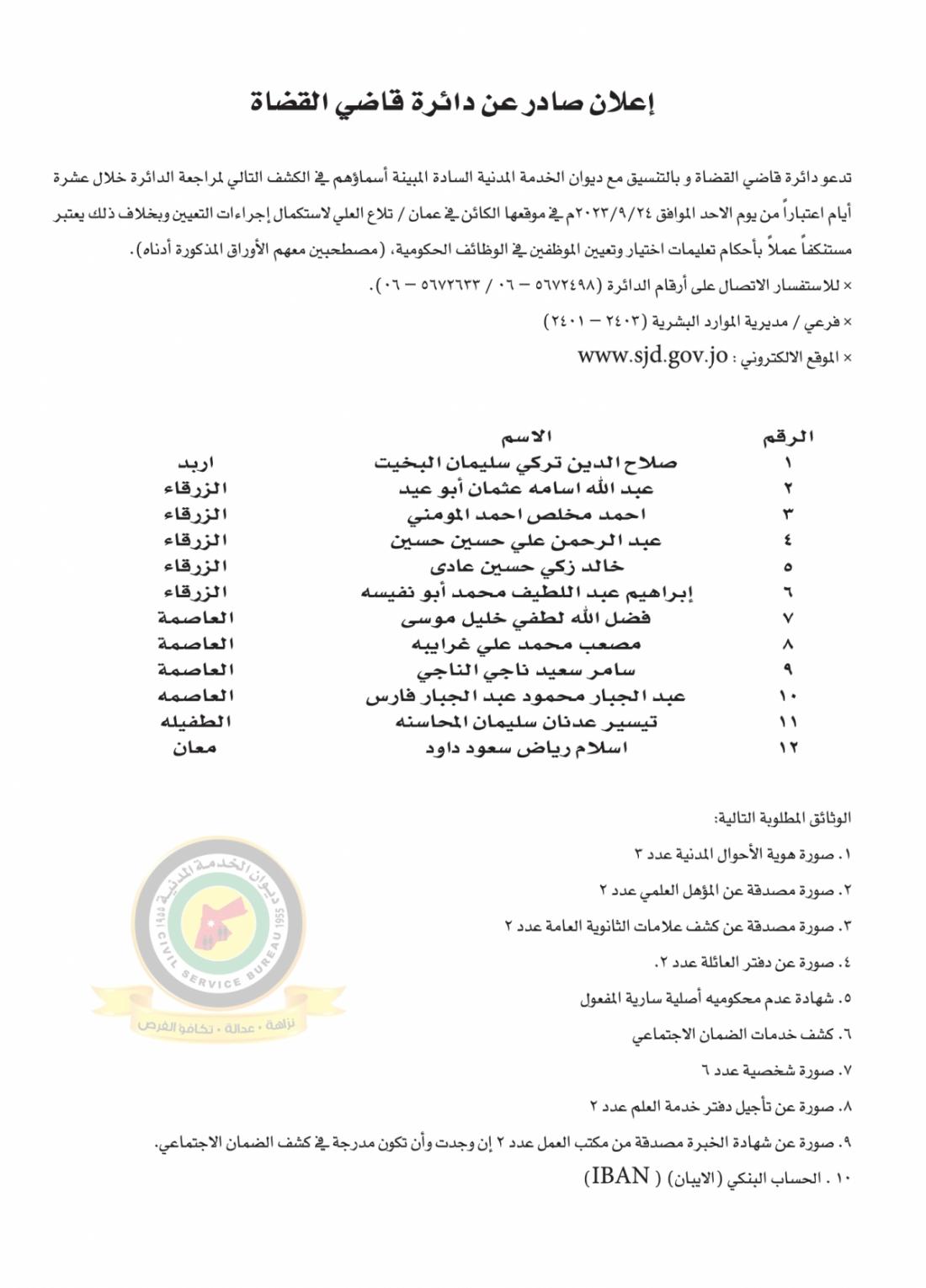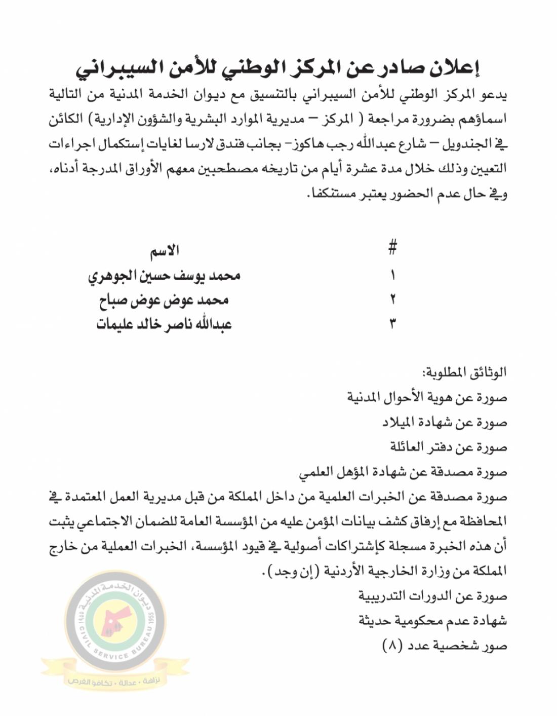 الراي نيوز  - دعا ديوان الخدمة المدنية المرشحين المدرجة أسماؤهم أدناه لإجراء الامتحان التنافسي الالكتروني في عدة وزارات ومؤسسات حكومية .