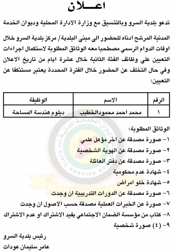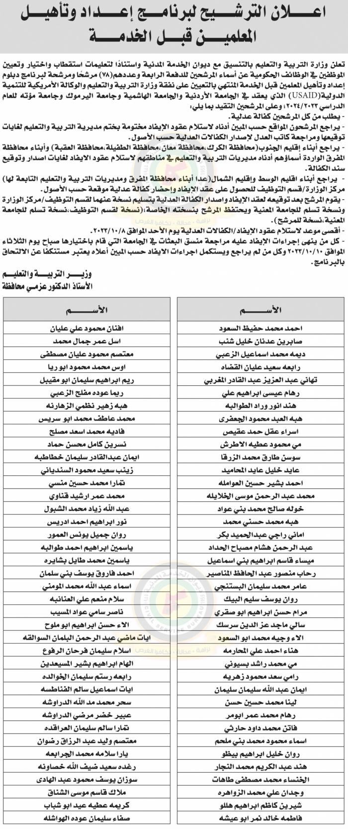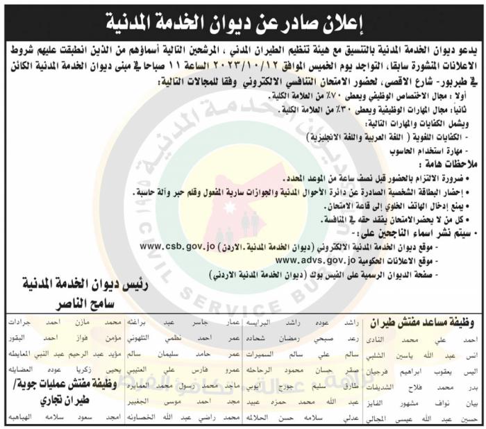 الراي نيوز  - دعا ديوان الخدمة المدنية المرشحين المدرجة أسماؤهم أدناه لإجراء الامتحان التنافسي الالكتروني في عدة وزارات ومؤسسات حكومية .
