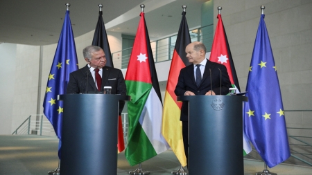 أجرى جلالة الملك عبدالله الثاني، الثلاثاء، محادثات مع المستشار الألماني أولاف شولتس في برلين، استكمالا للقاءات يجريها جلالته في جولة أوروبية لحشد موقف دولي لوقف الحرب على غزة، تشمل بريطانيا وإيطاليا وألمانيا وفرنسا.