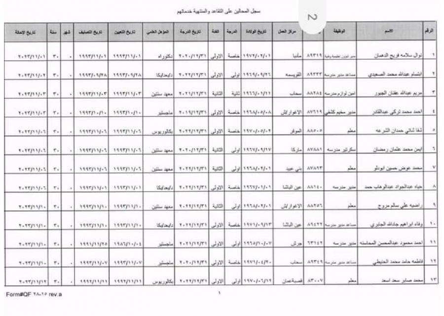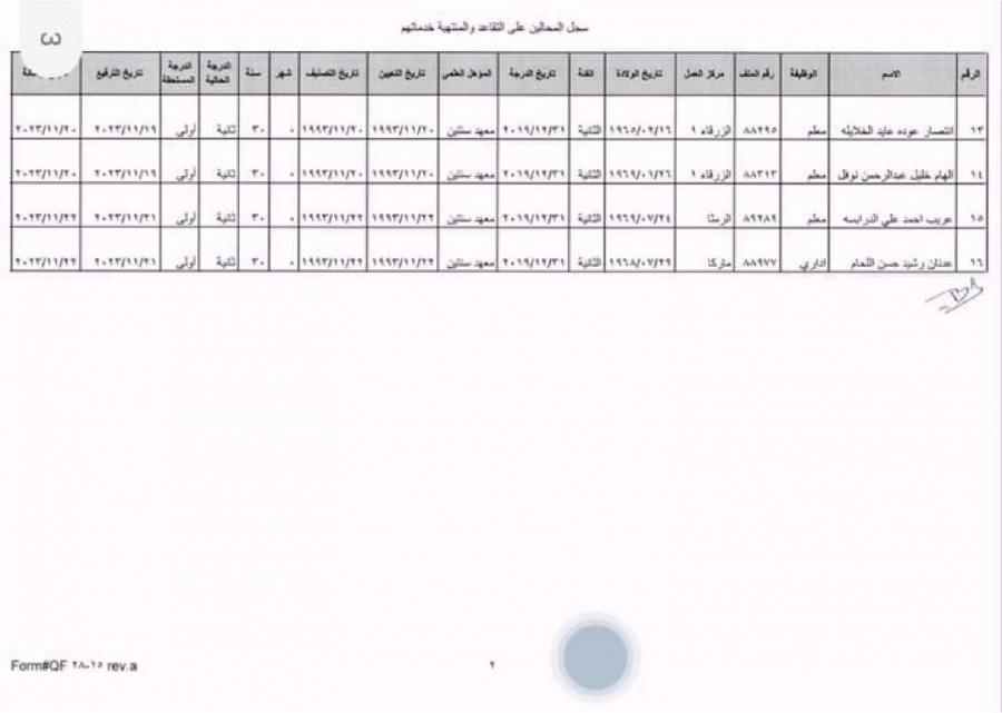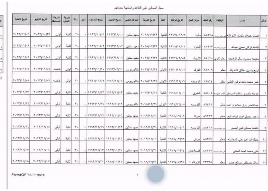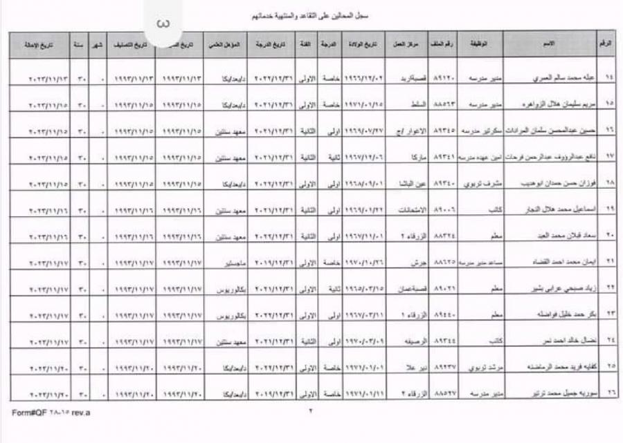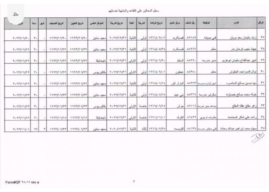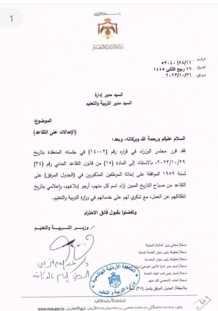 الراي نيوز  - قرر مجلس الوزراء الموافقة على إحالة موظفين من ملاك وزارة التربية والتعليم على التقاعد من صباح التاريخ المبين إزاء اسم كل منهم في الجدول المرفق.