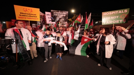 الراي نيوز  - نفذت النقابات الصحية في الأردن مساء الاثنين، مسيرة تضامنية في عمّان مع قطاع غزة الذي يئن تحت وطأة عدوان إسرائيلي منذ نحو شهر، ورفضا لتعرض المستشفيات والفرق الصحية للاستهداف.