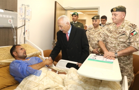 واستمع العيسوي، بحضور مدير عام الخدمات الطبية الملكية العميد الطبيب يوسف جمال زريقات، إلى شرح عن الحالة العامة للمصاب.
