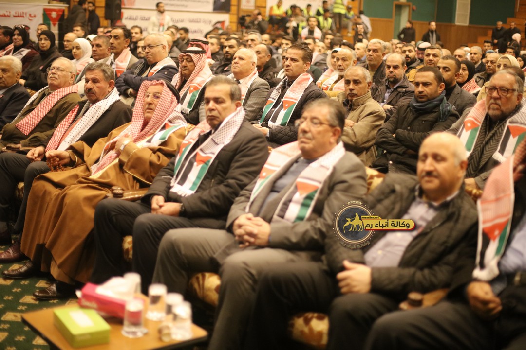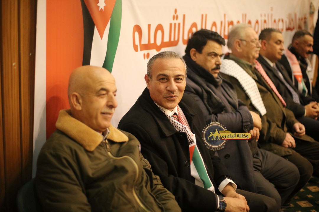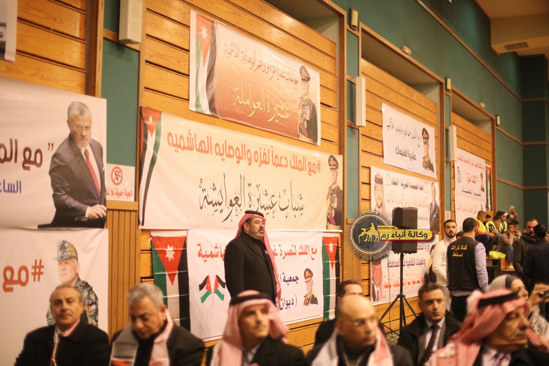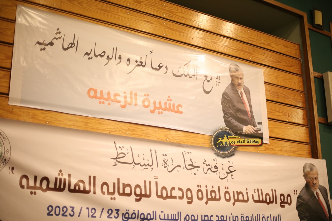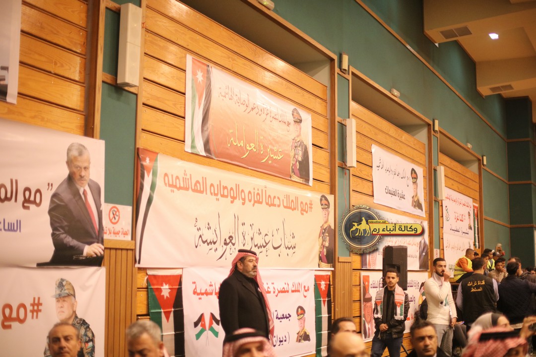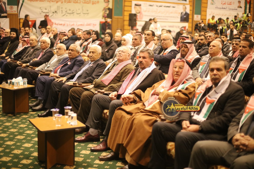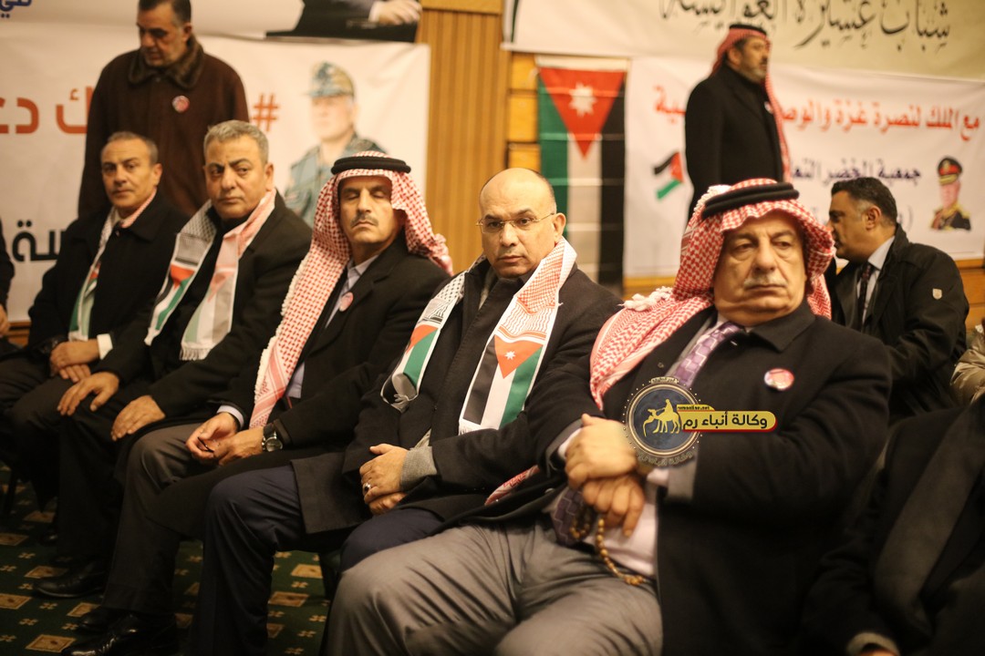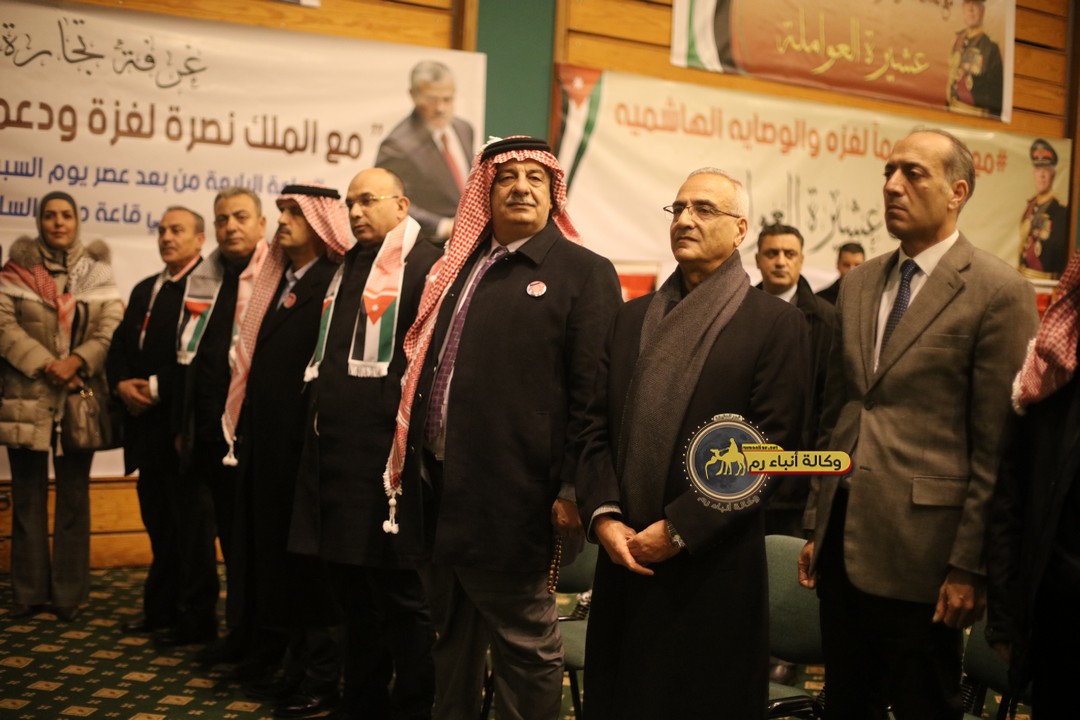 "مع الملك نصرة لغزة و دعماً للوصاية الهاشمية " على ضرورة رص الصفوف وتوحيد الصف ليبقى الاردن القوي المنيع الداعم بكل طاقته بالدفاع عن الاهل في دولة فلسطين العربية المحتلة .