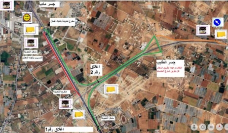 - اغلاق (رقم 2) سيتم تحويل السير القادم من ممر عمان التنموي (شارع ال ١٠٠) إلى مسرب الخدمة قبل جسر الطنيب بإتجاه عمان والعودة إلى شارع المطار عبر أول مخرج لشارع الخدمات بعد موقع الجسر المراد تركيبه، و يبقى السير المتجه الى طريق مطار الملكة علياء و محافظات الجنوب كما هو.