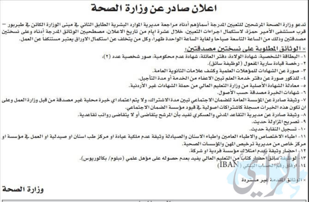 الرأي نيوز - دعت وزارة الصحة بالتعاون مع ديوان الخدمة المدنية، العشرات من المرشحين والمرشحات؛ لاستكمال إجراءات التعيين.